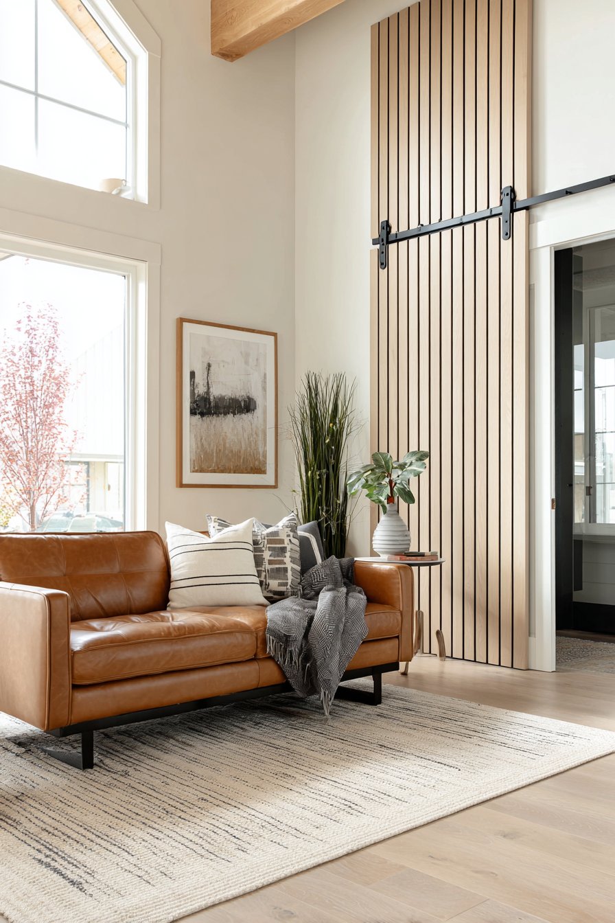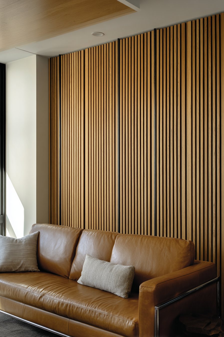 The practical benefits of this wall treatment extend beyond aesthetics. The slats can help with acoustic dampening in open-concept spaces, and the vertical lines can visually correct awkward room proportions. When positioned behind a seating area, this feature wall creates a sense of enclosure and coziness without requiring structural changes. The natural wood also introduces biophilic design elements that research shows can reduce stress and improve wellbeing.