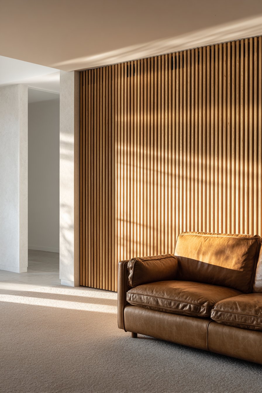 Key Design Tips: Choose slats with consistent grain patterns for a refined look, or embrace natural variations for more character. Space slats 2-3 inches apart for optimal shadow effect without excessive material costs. Mount slats on a painted backing board in a contrasting color to enhance the dimensional effect. Consider adding integrated LED strip lighting behind slats for dramatic evening ambiance. Seal wood with a clear matte finish to protect against moisture while maintaining natural appearance.