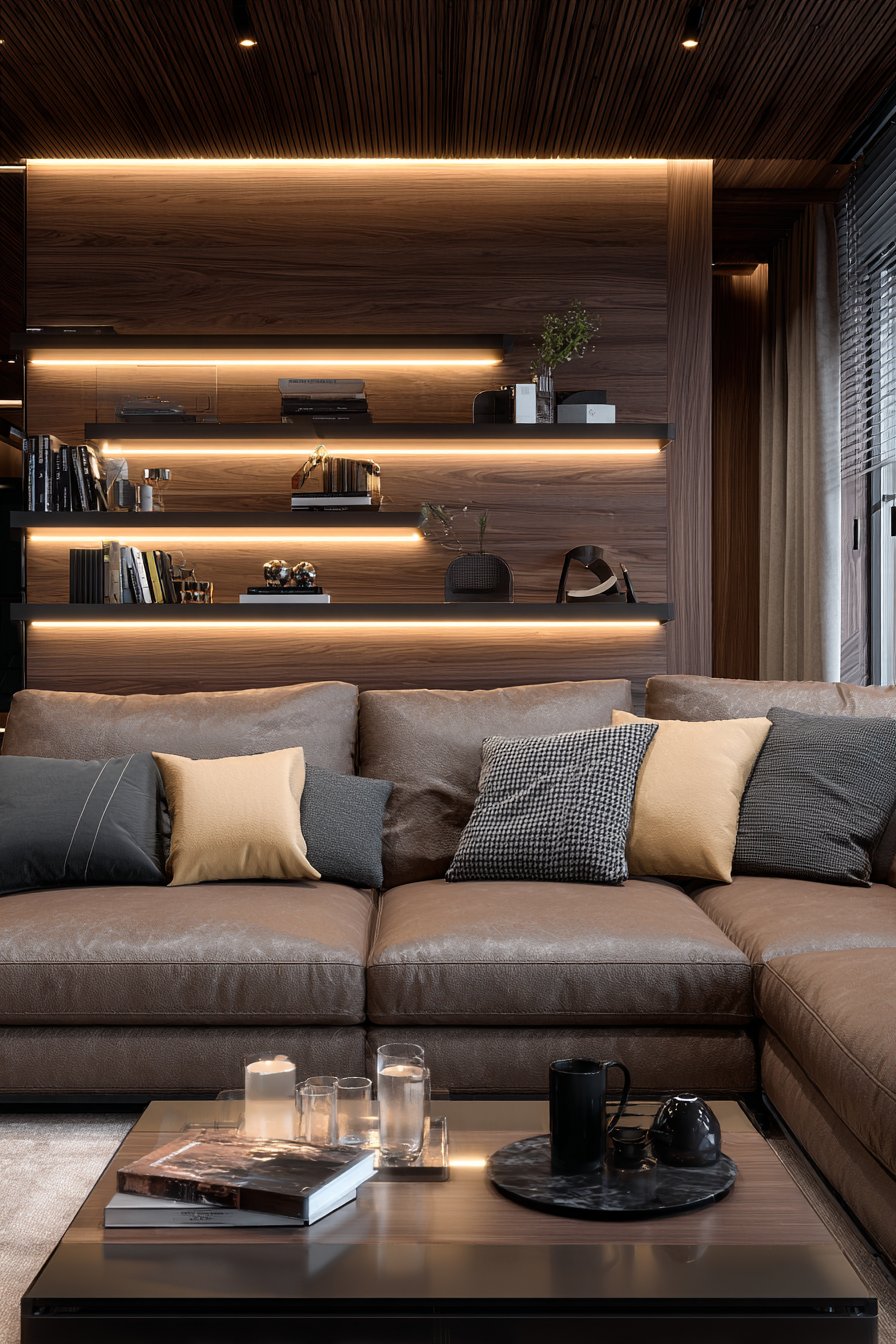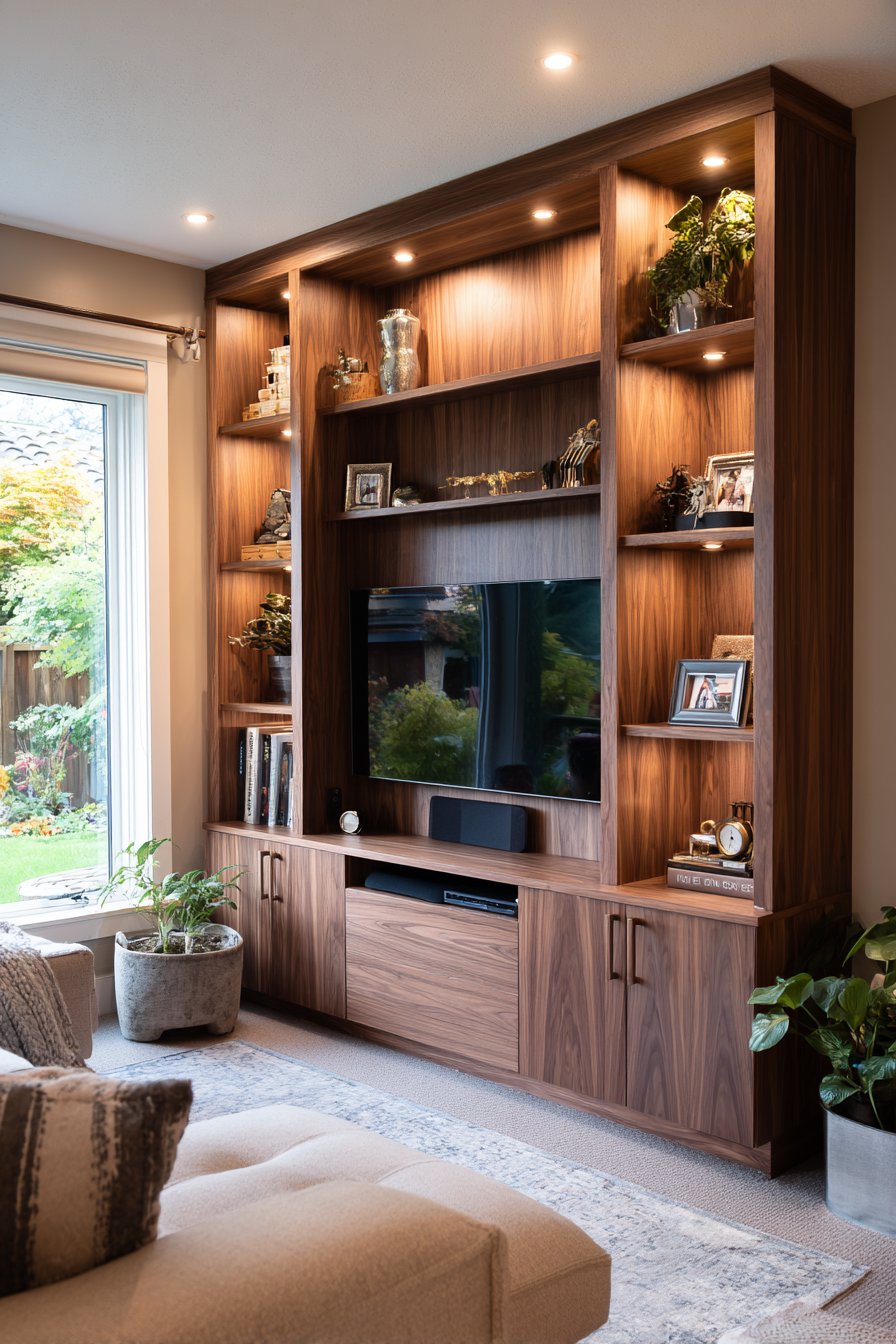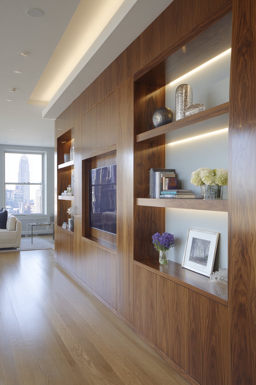 Custom built-in media walls represent significant investments that pay dividends in both functionality and aesthetics. This design features warm walnut wood veneer millwork with integrated shelving, concealed storage, and carefully planned wire management systems. The custom cabinetry includes open display niches for books and decorative objects, creating visual variety within the unified design. LED strip lighting within shelves provides subtle ambient glow that highlights displayed items while reducing harsh contrast in dark rooms during media viewing.