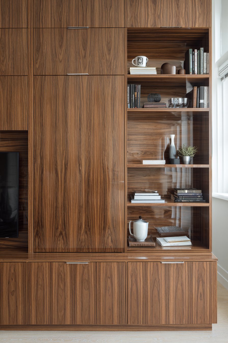 The built-in approach solves multiple challenges simultaneously—it accommodates large-screen televisions while minimizing their visual dominance, provides storage for electronics and media, displays personal collections, and creates architectural interest through custom proportions and materials. The walnut veneer introduces natural warmth and organic grain patterns that prevent the wall system from feeling too mechanical or technology-focused. The seamless integration makes all components feel intentional and permanent rather than assembled or afterthought.