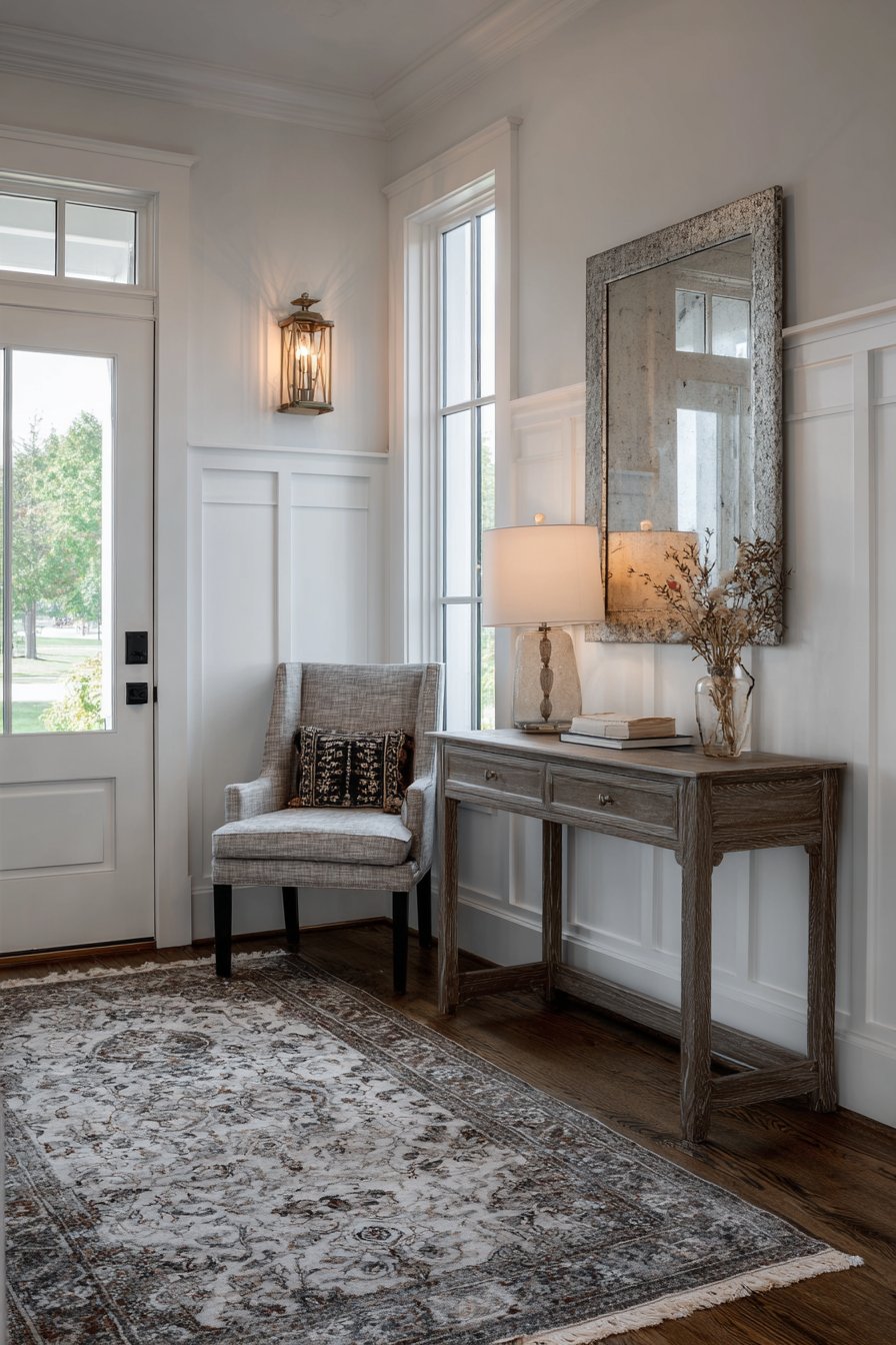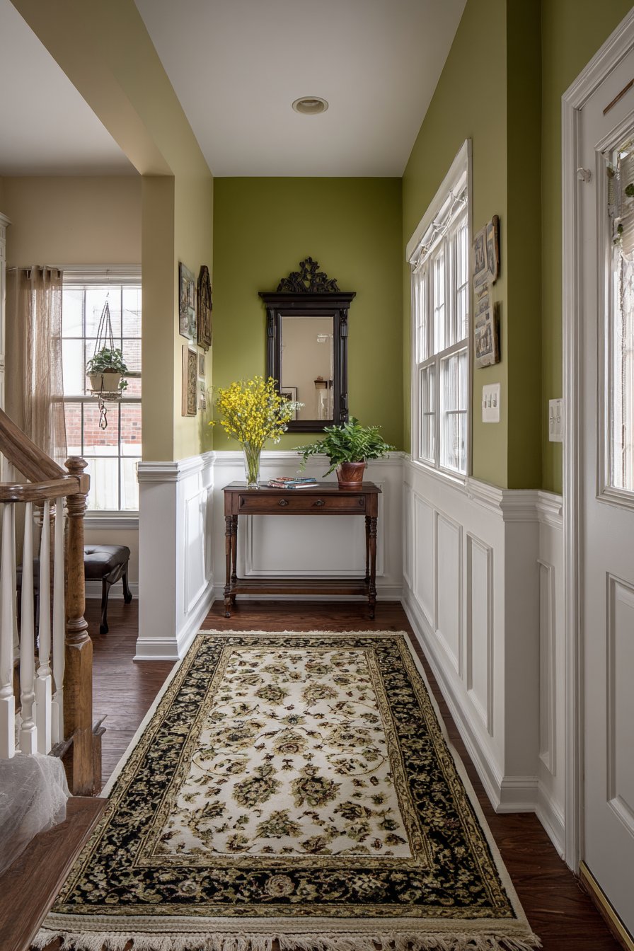 The two-tone paint approach—white below, sage green above—creates visual sophistication while serving practical purposes. The darker upper wall hides scuffs and marks better than all-white walls, while the white wainscoting reflects light in typically darker entryway spaces. The chair rail creates a clear delineation between the two colors, preventing the transition from feeling arbitrary. The sage green introduces on-trend color while remaining neutral enough to work with various decor styles and color schemes.