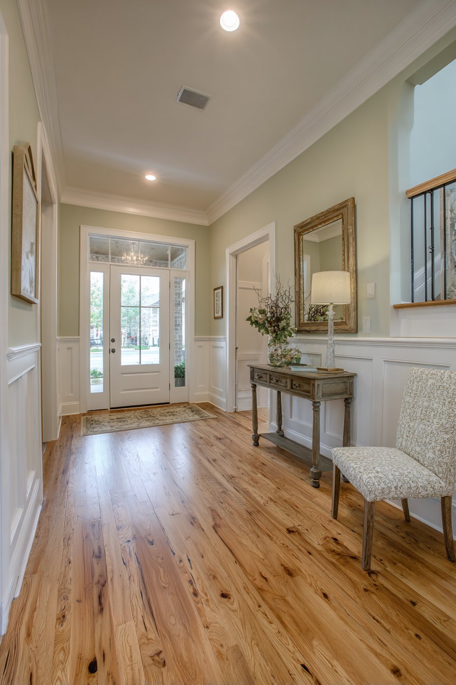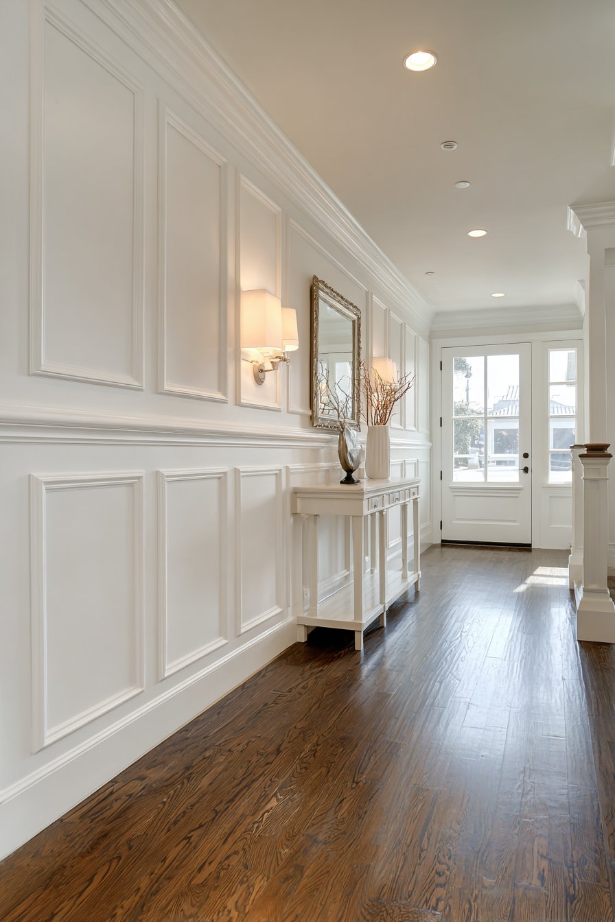 Classic wainscoting demonstrates how traditional architectural details remain relevant in contemporary homes when executed with thoughtful color choices and proper proportions. This design features crisp white panel molding extending three feet from the floor, topped with chair rail detail and sage green paint above. The traditional panel detailing creates dimensional interest through raised frames that catch light and create subtle shadows, adding craftsmanship character to even the narrowest entryway.