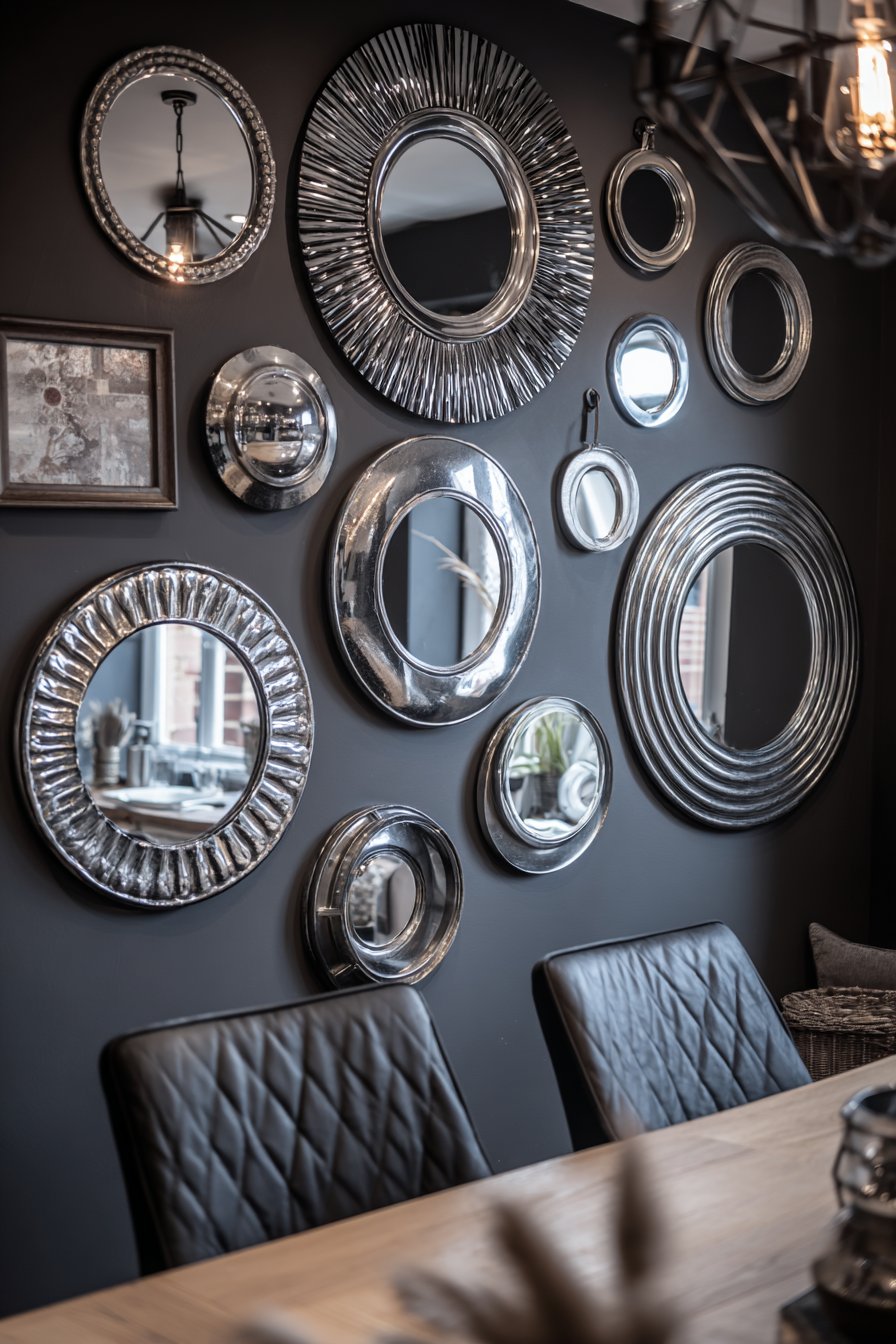 Mirror gallery walls offer unique opportunities to enhance light, expand perceived space, and create focal points with sculptural dimension. This design features various vintage and modern mirrors in mixed metal finishes—brass, silver, bronze, and black—arranged in an eclectic composition that functions as wall art while serving the practical purpose of reflecting light throughout the space. The deep charcoal wall color provides dramatic backdrop that makes the metallic frames pop while creating sophisticated depth.
