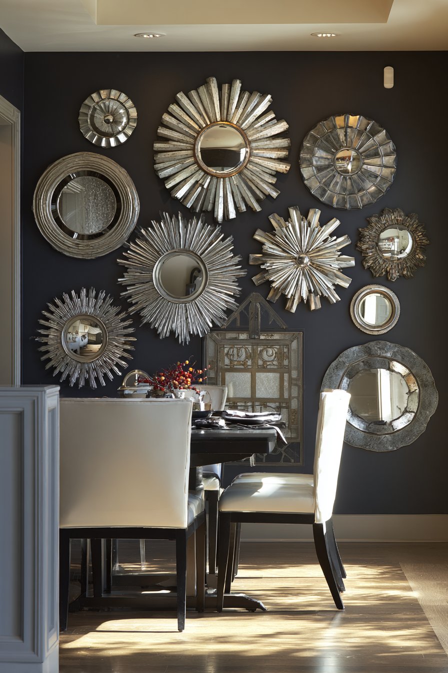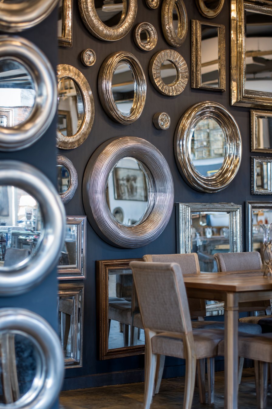 Key Design Tips: Create paper templates of each mirror and arrange on floor before hanging to test composition. Vary mirror sizes but include at least one large piece (24 inches or larger) to anchor arrangement. Space mirrors closer together than traditional gallery wall artwork to create more unified installation. Hang mirrors at varying depths (some flat, some on standoffs) for additional dimension. Consider reflections carefully—avoid positioning mirrors where they reflect unflattering views or create awkward sight lines. Use appropriate hanging hardware for mirror weight to ensure safety. Group mirror styles loosely—cluster vintage pieces together, modern pieces together—for organized eclecticism. Include convex or concave mirrors for additional visual interest and unique reflections.