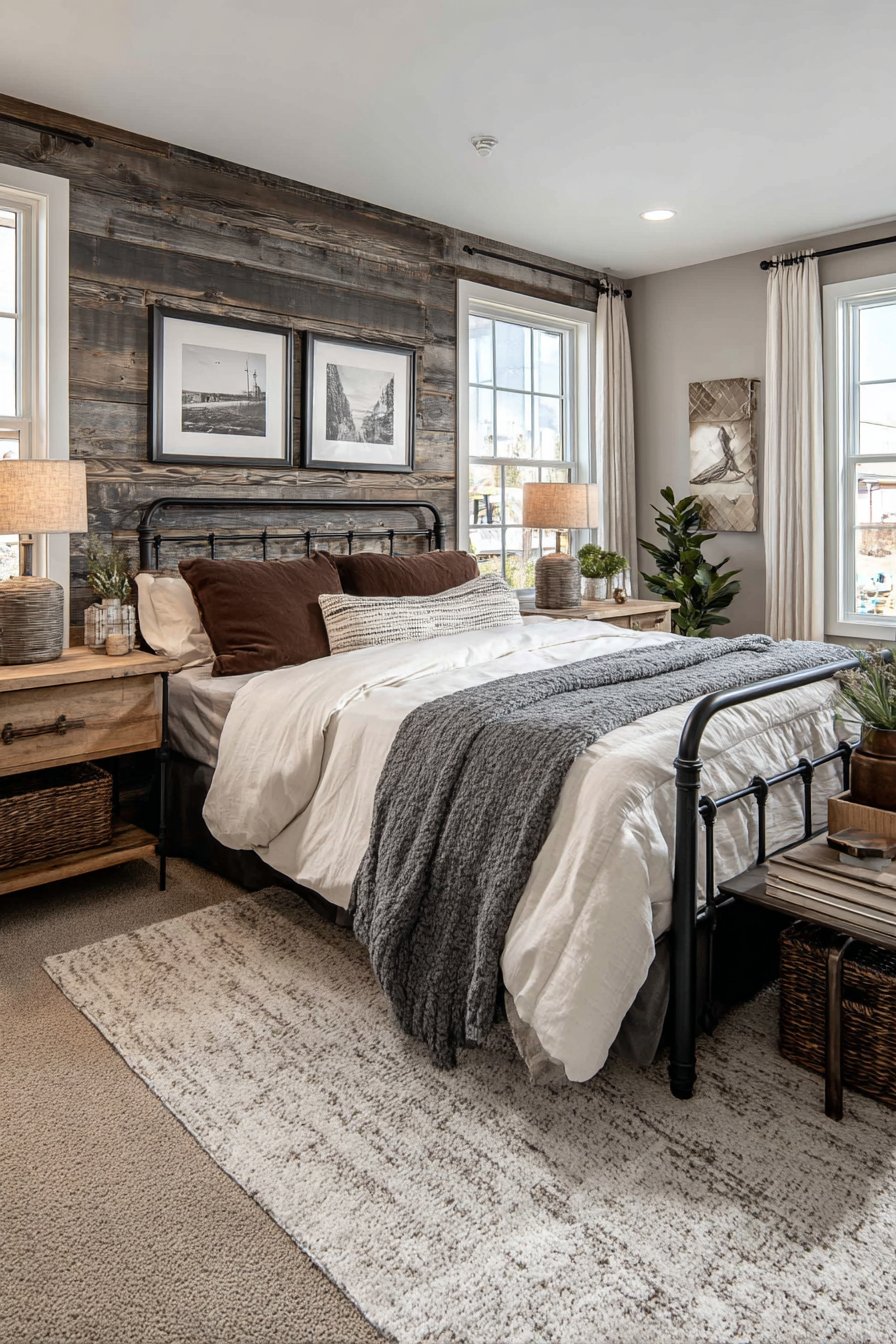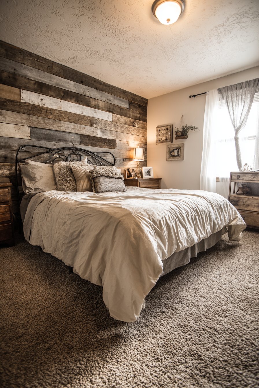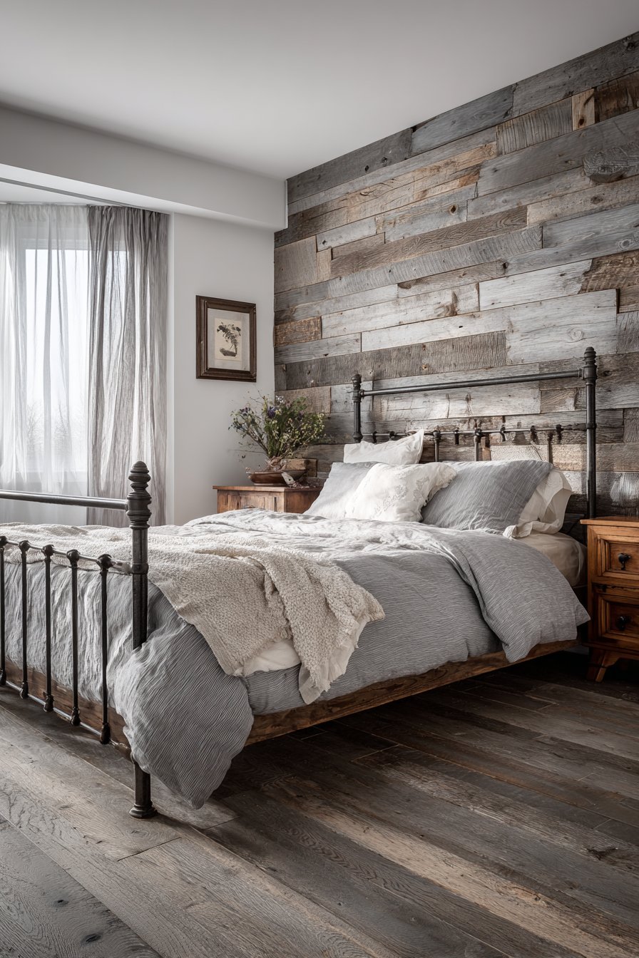 The horizontal installation creates visual flow that makes walls appear wider while the varied plank widths prevent monotonous repetition. The mixed finish approach—some planks gray-washed, others left natural—adds depth and visual interest while preventing the wall from feeling too uniform or manufactured. The rustic modern aesthetic pairs beautifully with both industrial elements like metal bed frames and softer touches like linen bedding, making it remarkably versatile for various design directions.