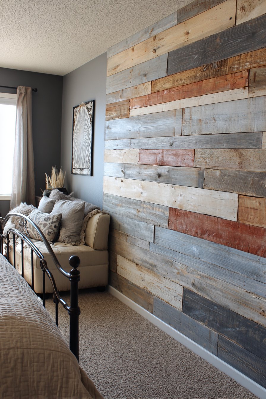 Reclaimed pallet wood accent walls bring authentic rustic character and sustainability to modern interiors while remaining accessible to DIY enthusiasts. This design features horizontal planks in mixed gray-washed and natural wood tones, creating organic texture through natural grain variations and weathered character. The authentic imperfections—nail holes, saw marks, color inconsistencies—tell stories and add the kind of character that new materials simply cannot replicate.