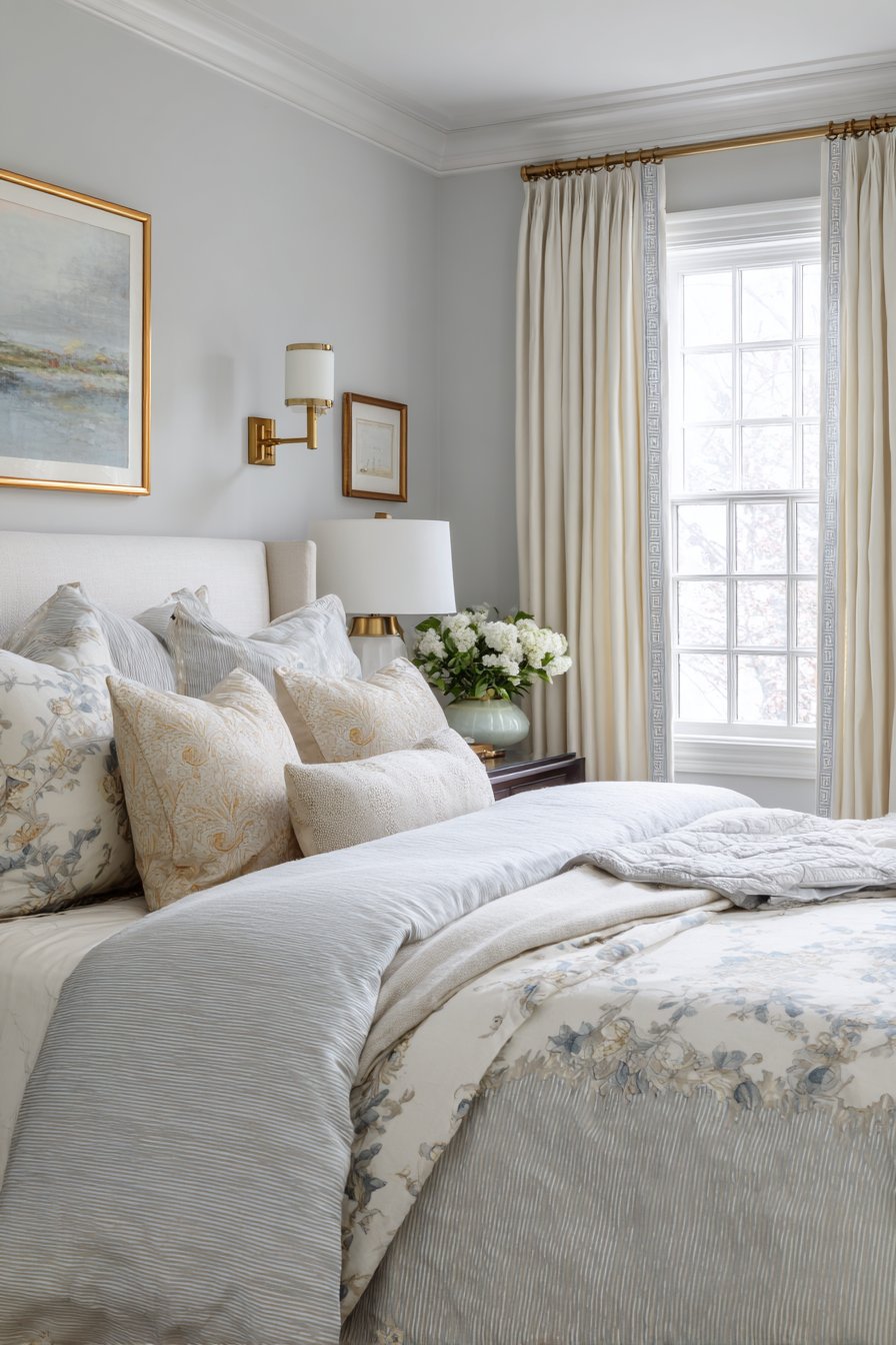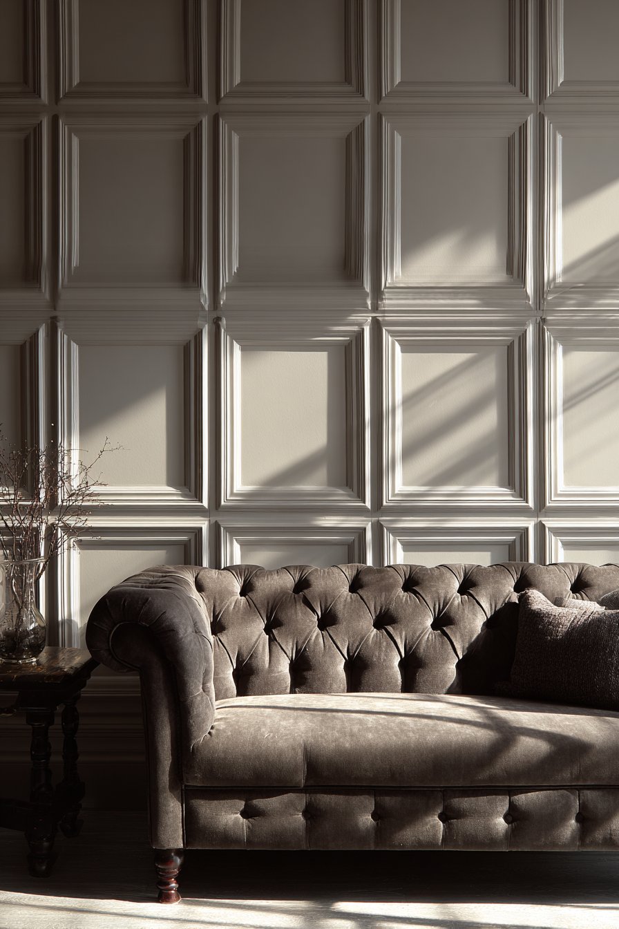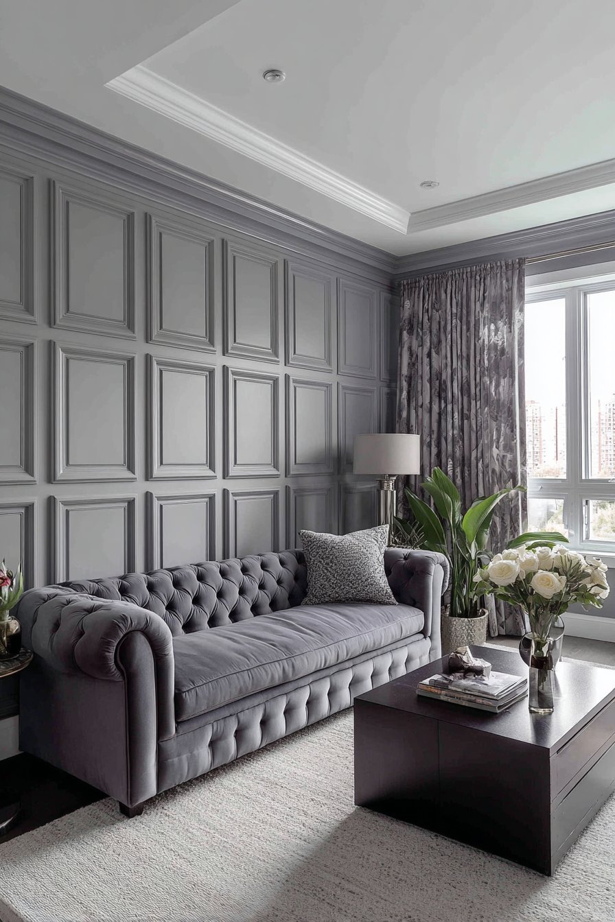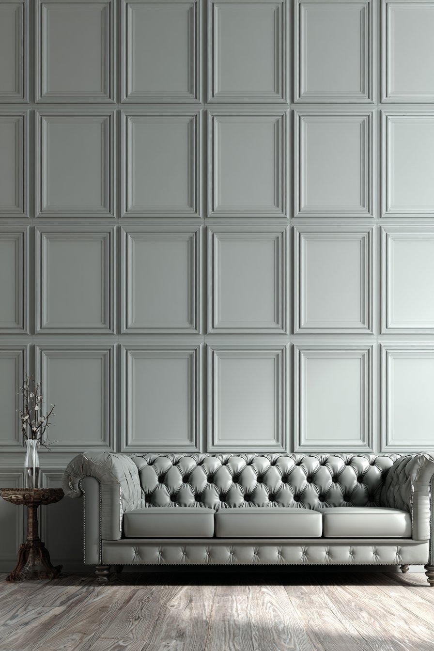 Picture frame molding represents understated elegance, creating architectural sophistication through carefully proportioned raised rectangles that add dimension without overwhelming spaces. This design features raised frames painted in the same soft gray as the base wall, allowing shadow and light to create the visual interest rather than color contrast. The monochromatic approach feels refined and timeless, working beautifully with both traditional furnishings and contemporary pieces.