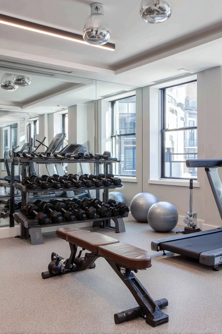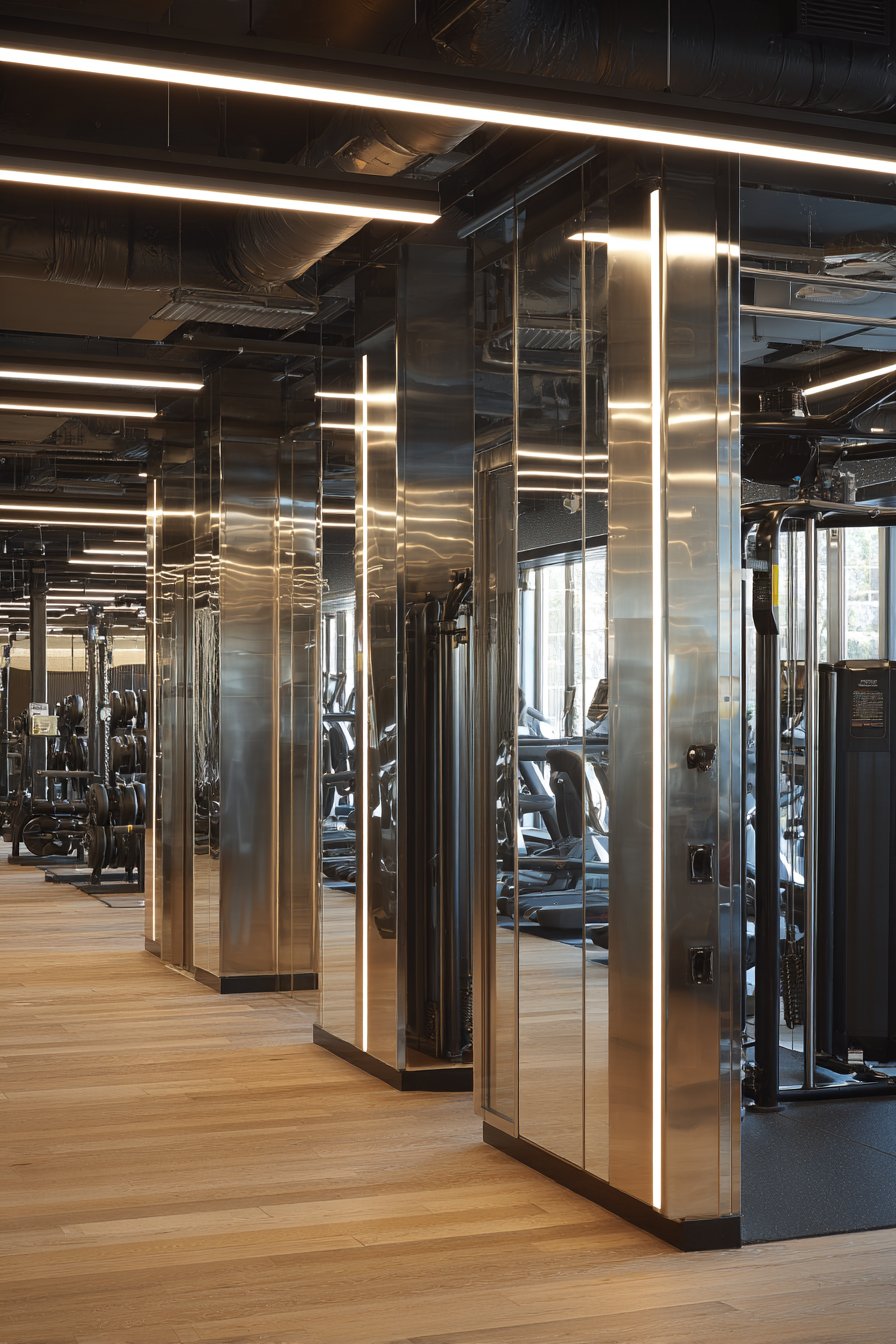The reflective surfaces interact carefully with lighting design. Overhead LED fixtures provide even illumination without creating harsh glare on the mirrors that would be distracting or visually uncomfortable during workouts. The increased light reflection from the mirrors also means the room requires less artificial lighting to achieve adequate brightness, creating energy efficiency alongside the aesthetic and functional benefits.