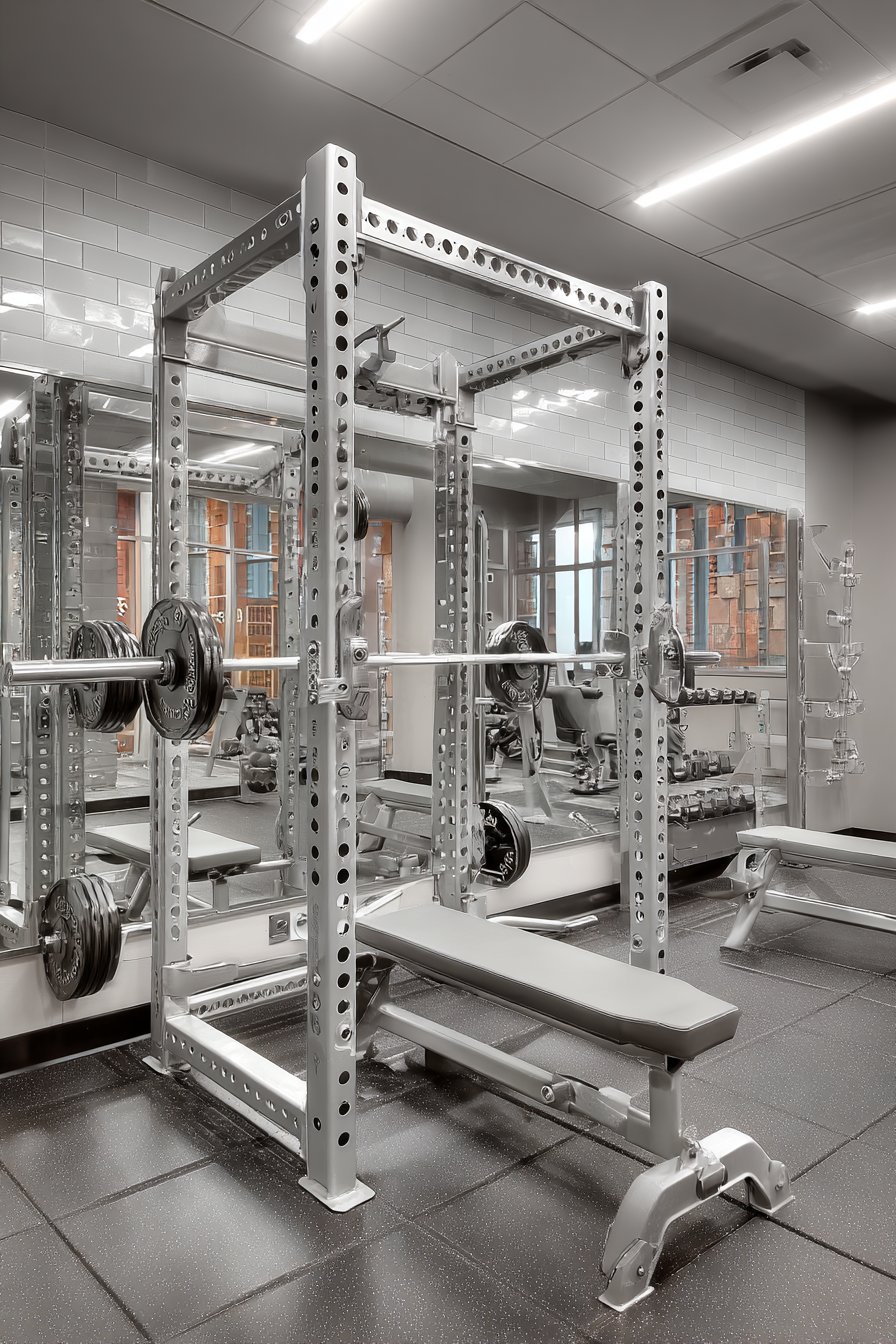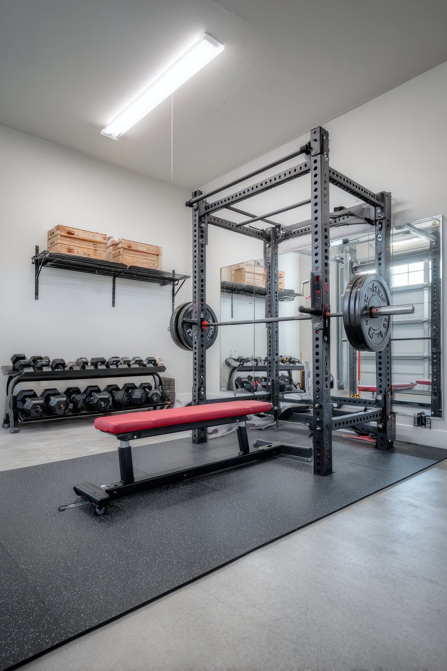 Wall-to-wall mirrors serve dual purposes in home gym environments—they provide essential functionality for monitoring exercise form while visually doubling the perceived space. This design features professionally installed mirror panels mounted edge-to-edge with minimal seams, creating expansive reflective surfaces that make even compact workout spaces feel larger and brighter. The strategic placement allows users to view themselves from multiple angles, essential for proper form and injury prevention during exercise.