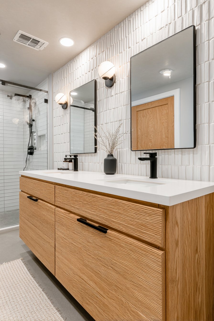The contrast elements—matte black fixtures and floating natural oak vanity—provide warmth and visual punctuation against the white tile canvas. These darker accents prevent the bright white surfaces from feeling sterile or clinical, instead creating balanced composition with the white tiles as a neutral foundation. The recessed lighting casts subtle shadows along the vertical grout lines, emphasizing the geometric pattern and adding dimensional interest.