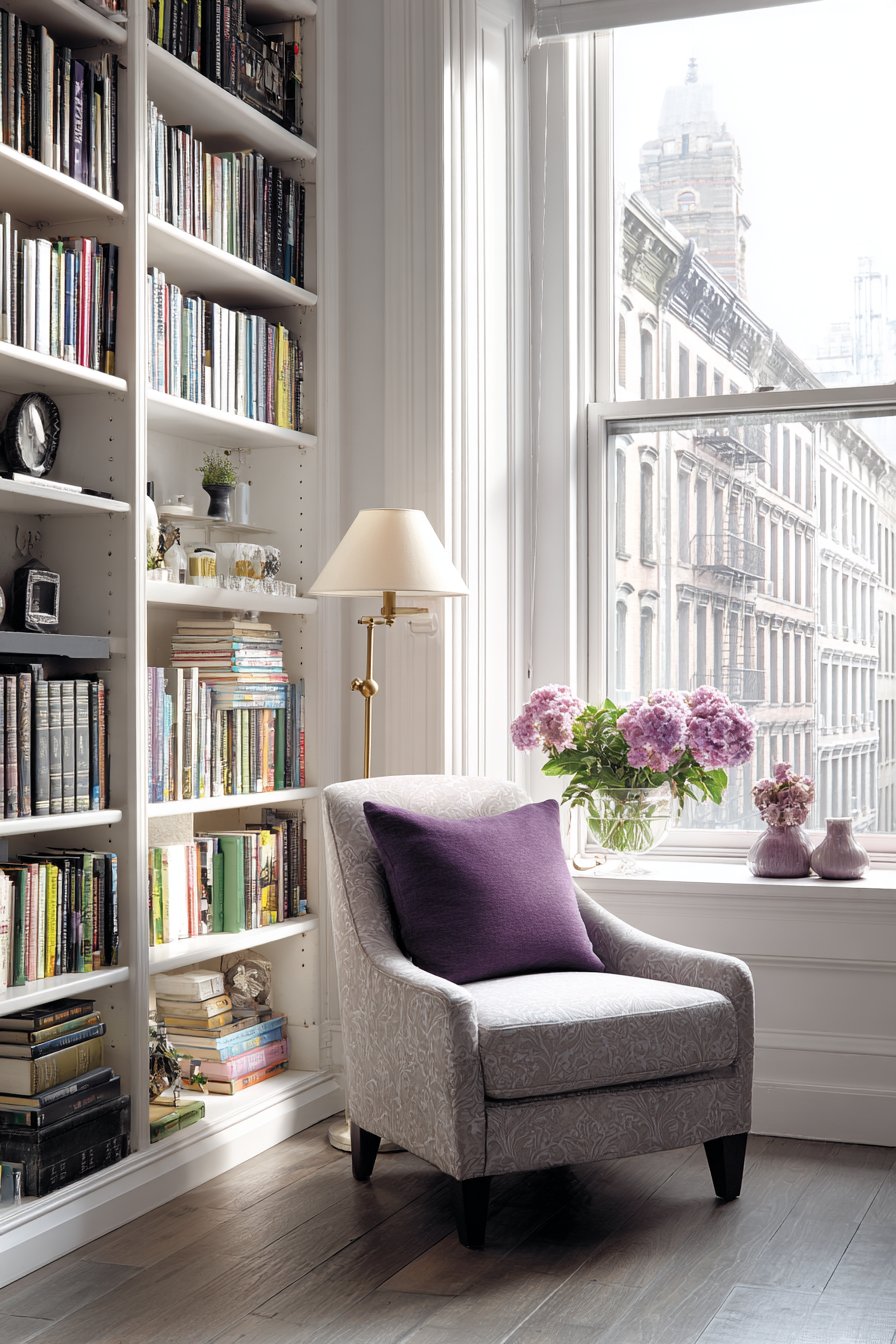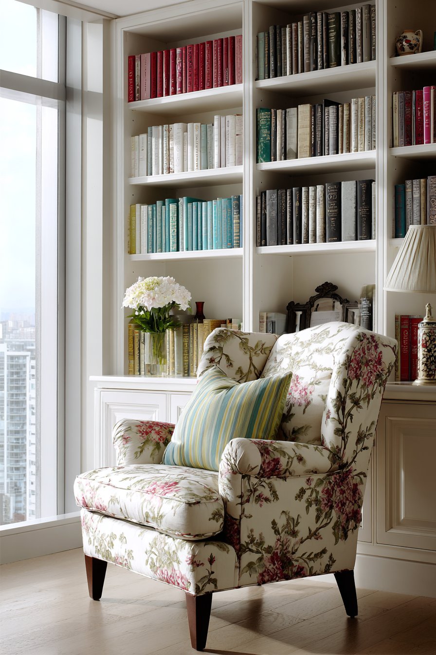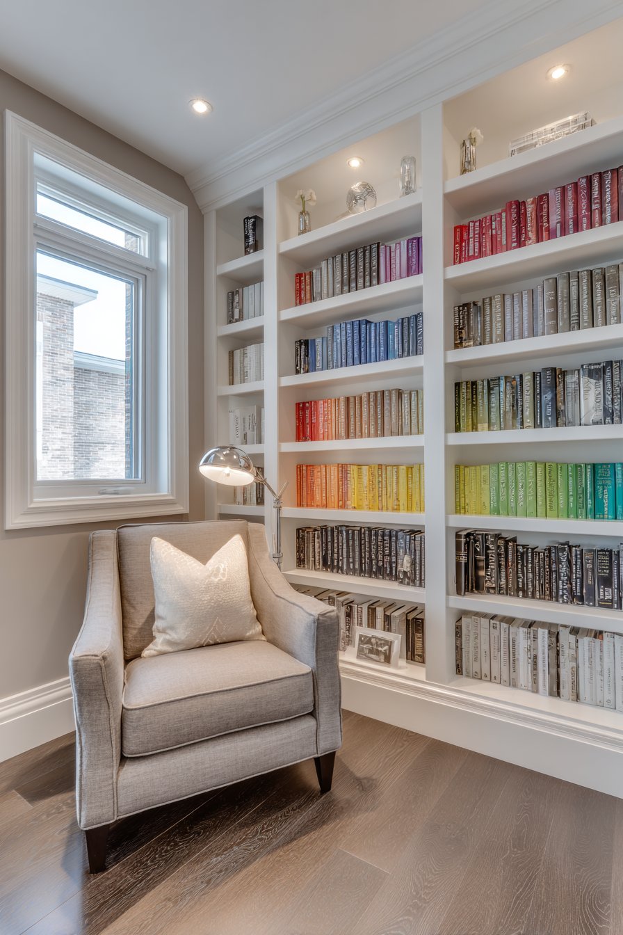 Built-in bookshelf walls transform entire wall surfaces into functional libraries while creating sophisticated backdrop for daily living. This design features custom white shelving spanning floor to ceiling with adjustable shelves that accommodate books of varying heights and decorative objects. The color-coordinated book spine arrangement—organizing volumes by color rather than author or subject—creates rainbow effect that doubles as visual art while maintaining the practical function of book storage.