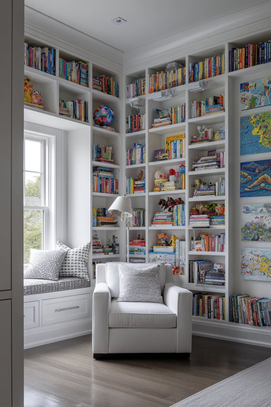 The comprehensive approach—dedicating entire walls to book storage—makes strong design statement about priorities and lifestyle, immediately communicating that reading and learning hold importance in the household. The built-in nature suggests permanence and investment, creating architectural feature rather than furniture-based solution. The white painted finish keeps the substantial storage from feeling heavy or overwhelming, instead maintaining light, airy quality even when shelves are fully loaded.