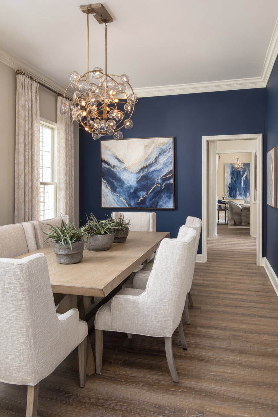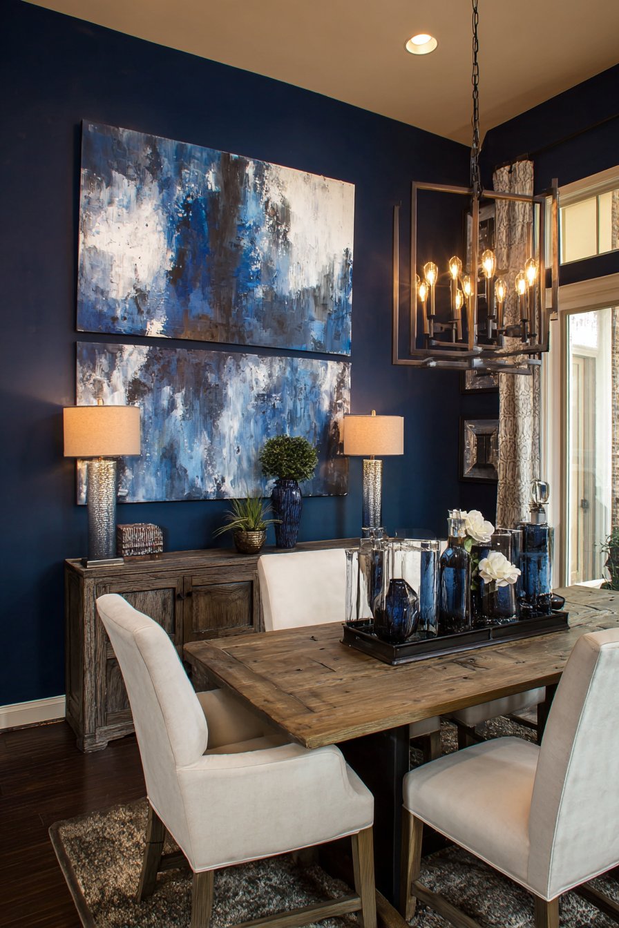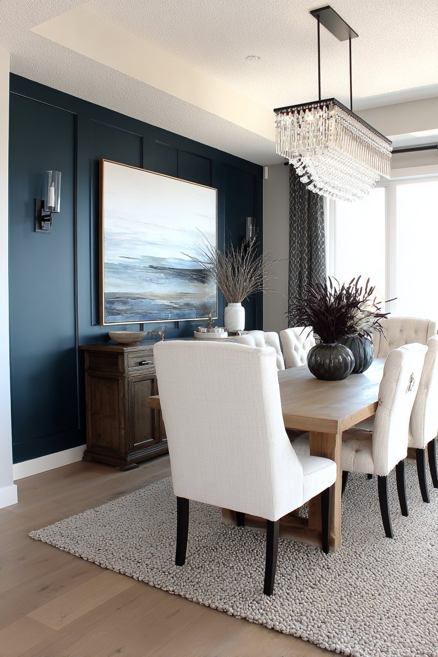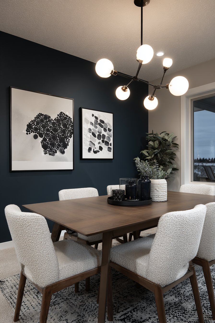 Bold dark accent walls create immediate drama and sophistication in dining spaces, demonstrating that dark colors can add depth and elegance rather than making rooms feel smaller or gloomier. This design features deep navy blue paint on a single wall, creating moody backdrop that serves multiple purposes—it grounds the space visually, provides contrast for artwork and lighting fixtures, and establishes intimate ambiance perfect for dinner gatherings.