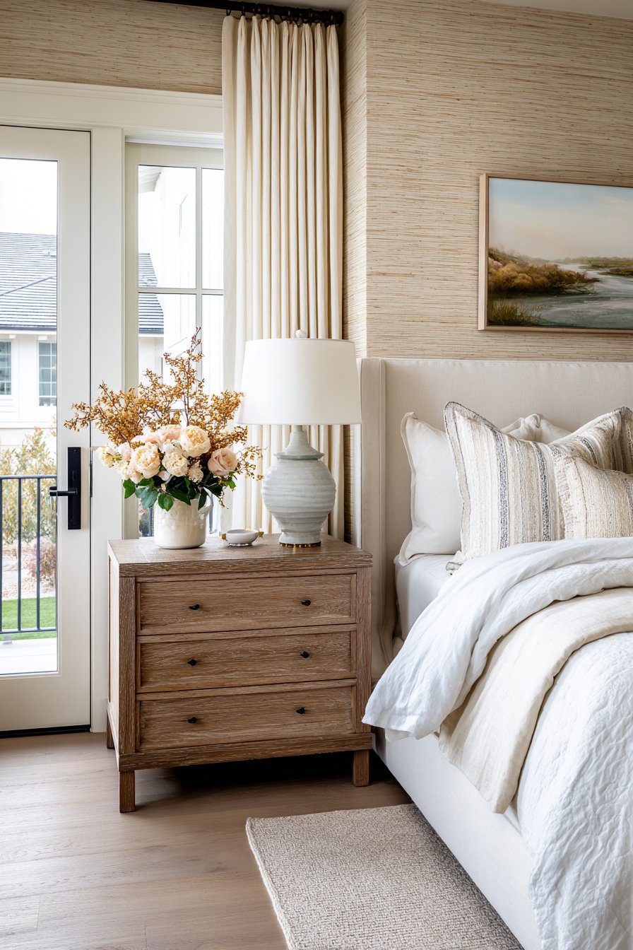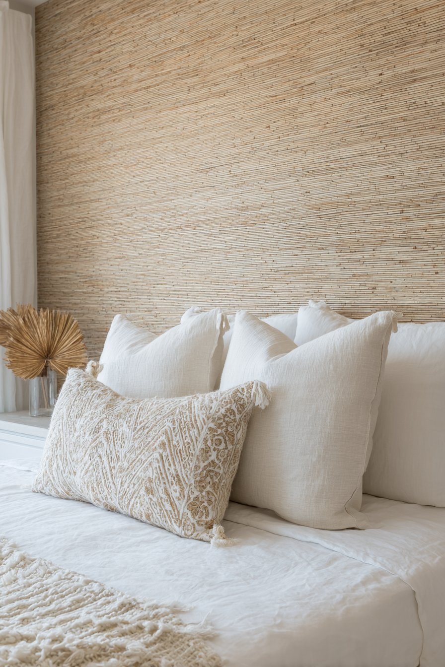Grasscloth wallpaper brings organic texture and subtle luxury to bedrooms while offering the advantage of temporary installation through modern peel-and-stick technology. This design features natural beige tones with authentic woven fiber visible in the material, creating dimensional texture that adds warmth and interest without pattern or color competition. The natural variations in the weaving—slight irregularities and color shifts—add authentic character that synthetic materials cannot replicate.
