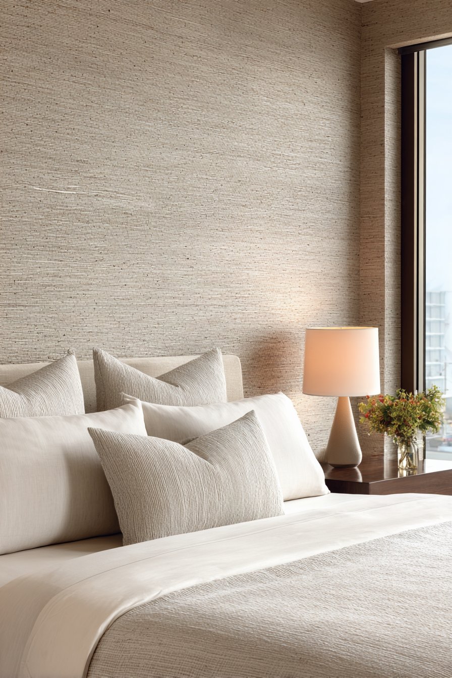 The organic nature of grasscloth introduces biophilic design elements that research shows can reduce stress and improve sleep quality. The neutral beige tones create calming backdrop perfect for bedroom applications where restful atmosphere is paramount. The textural interest provides visual engagement without being stimulating or demanding, allowing the room to feel sophisticated yet peaceful. The material’s natural properties also provide subtle sound absorption, contributing to quieter sleeping environment.