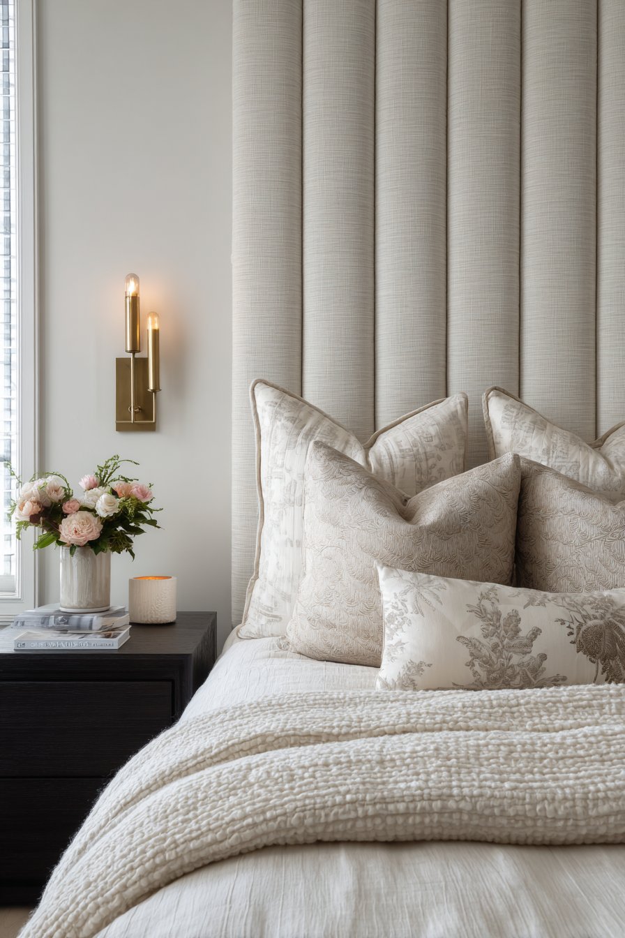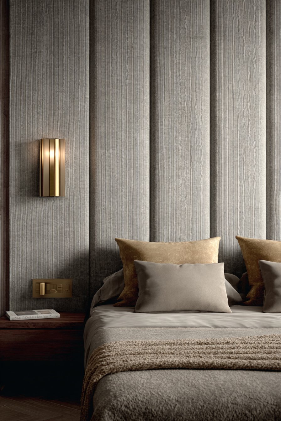 The tactile quality of fabric-covered walls introduces an element of sensory luxury that paint or wallpaper simply cannot match. The linen’s natural texture and slight irregularities in the weave add organic authenticity, while the channel tufting introduces architectural precision. Brass wall sconces mounted directly onto the upholstered surface provide functional task lighting while their metallic finish creates elegant contrast against the soft gray textile.