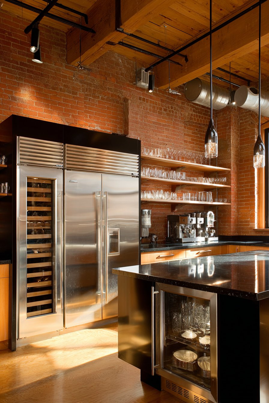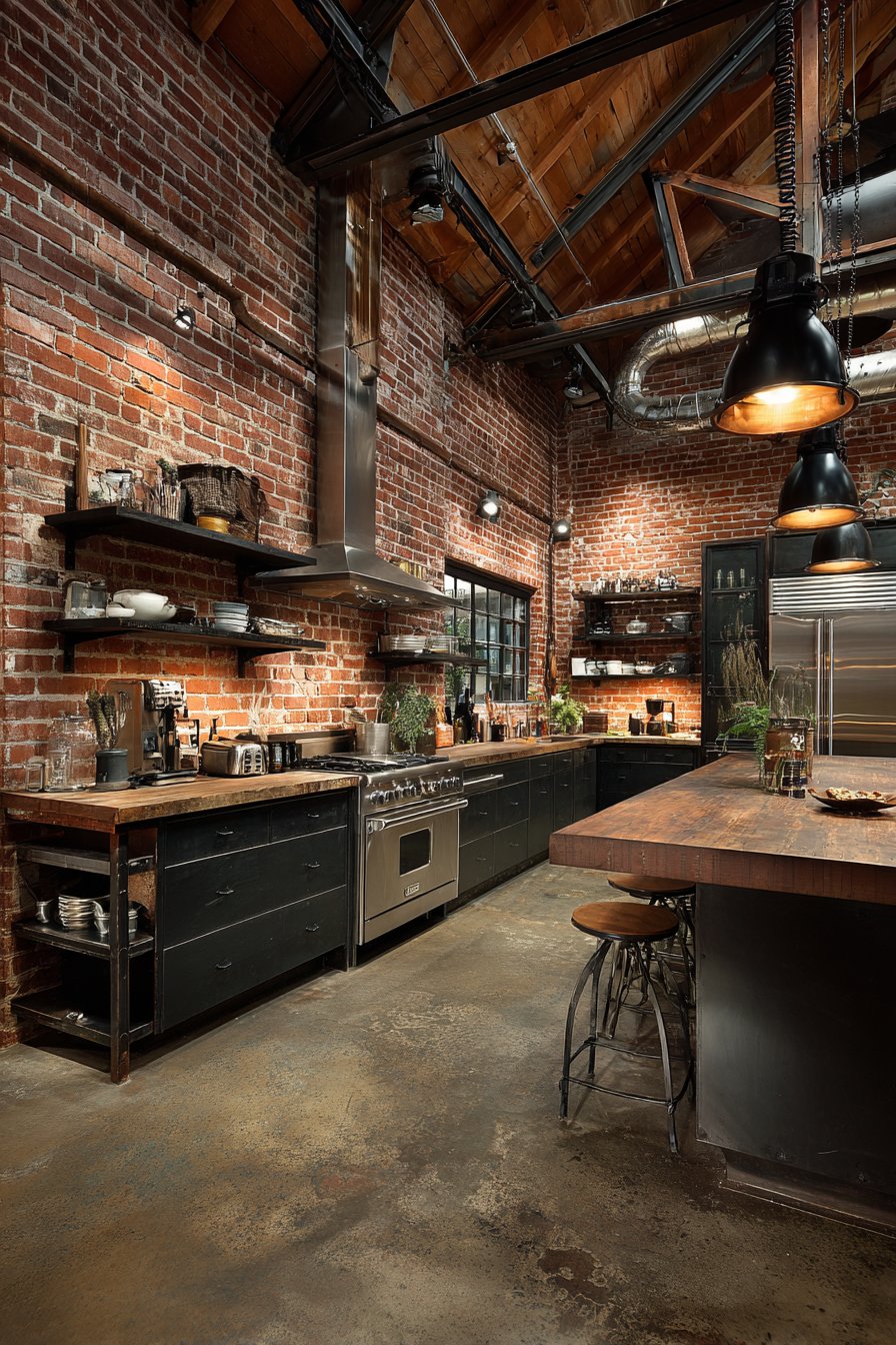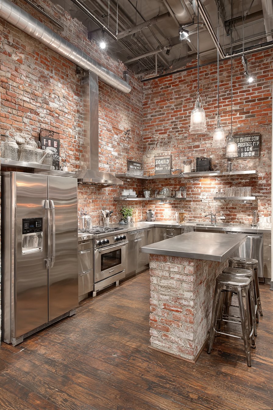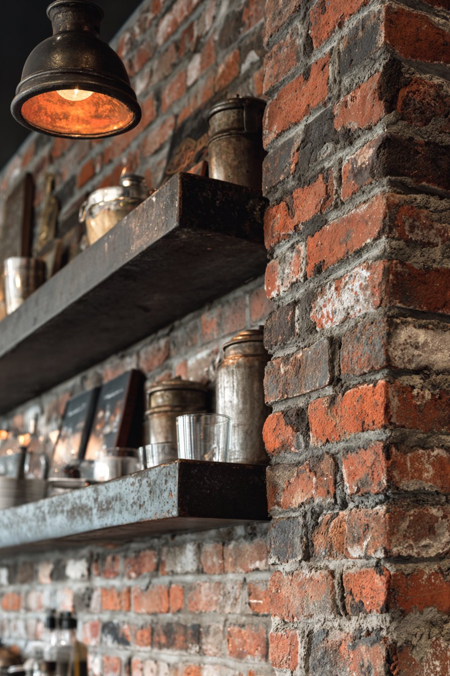 Key Design Tips: Clean historical brick gently with wire brush and mild detergent solution before sealing. Apply breathable penetrating sealer designed for interior brick to protect against moisture while allowing natural vapor transmission. Leave mortar texture visible rather than repointing unless structural integrity is compromised. Consider whitewashing or painting brick if full color feels too intense, though this is permanent decision. Install open shelving or minimal upper cabinets against brick walls to showcase the texture rather than covering it. Use spotlighting or track lighting to highlight brick texture and create dramatic shadows. Understand that brick is porous and may show staining in kitchen environments—seal thoroughly and plan for periodic resealing. Consider heating and cooling implications as brick walls affect thermal properties differently than insulated conventional walls.