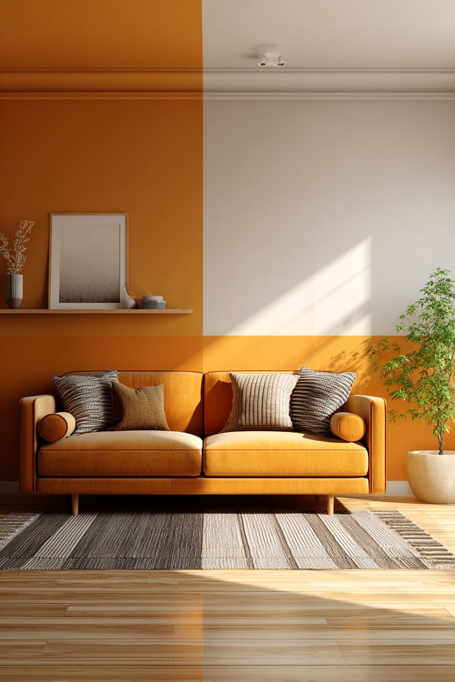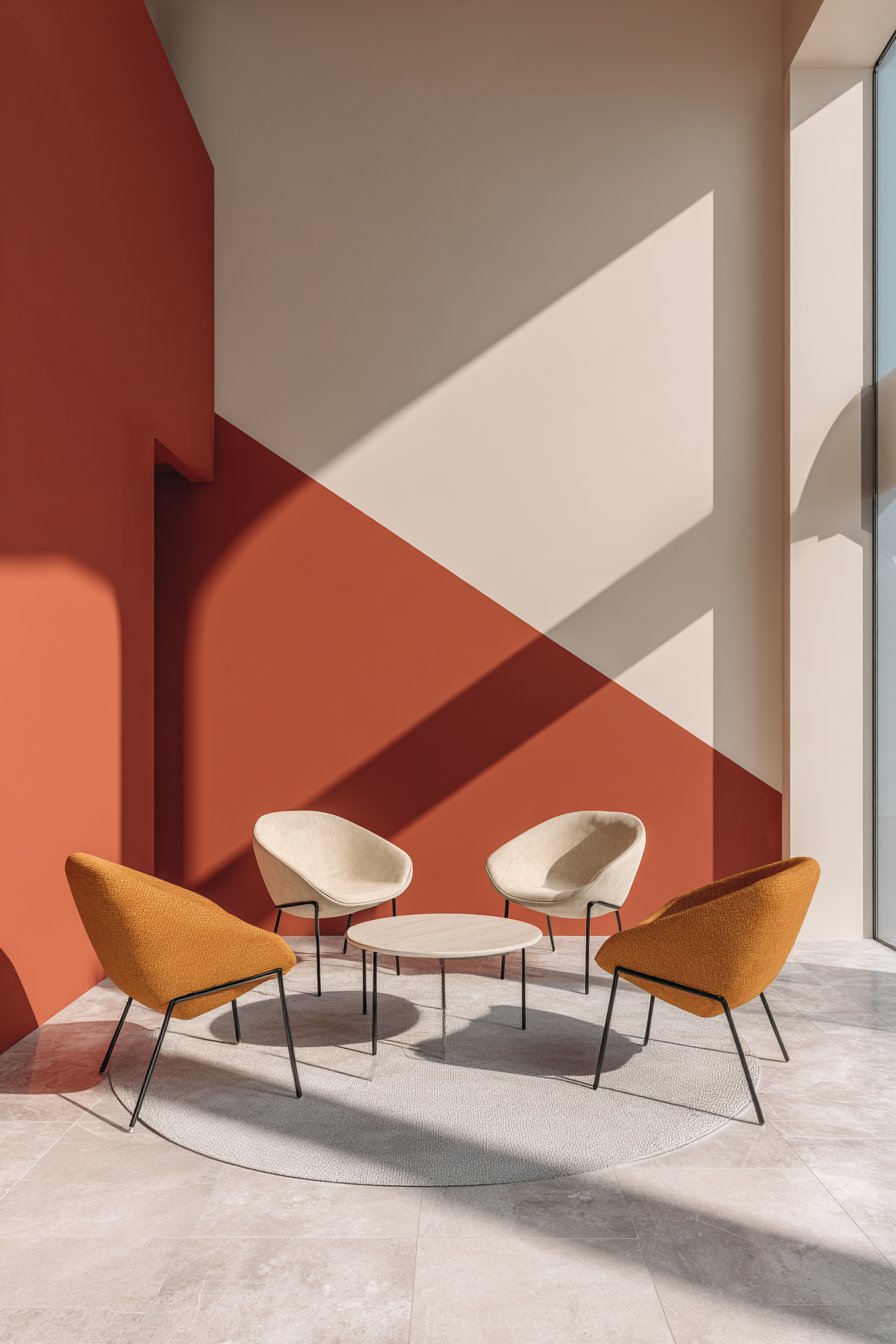 Modern color blocking represents accessible, high-impact wall design that requires only paint, painter’s tape, and careful execution. This design features two complementary colors divided horizontally with warm terracotta occupying the lower two-thirds of the wall and soft cream on the upper third. The clean, straight transition line creates bold contemporary statement that introduces color drama without additional materials or complex installation.