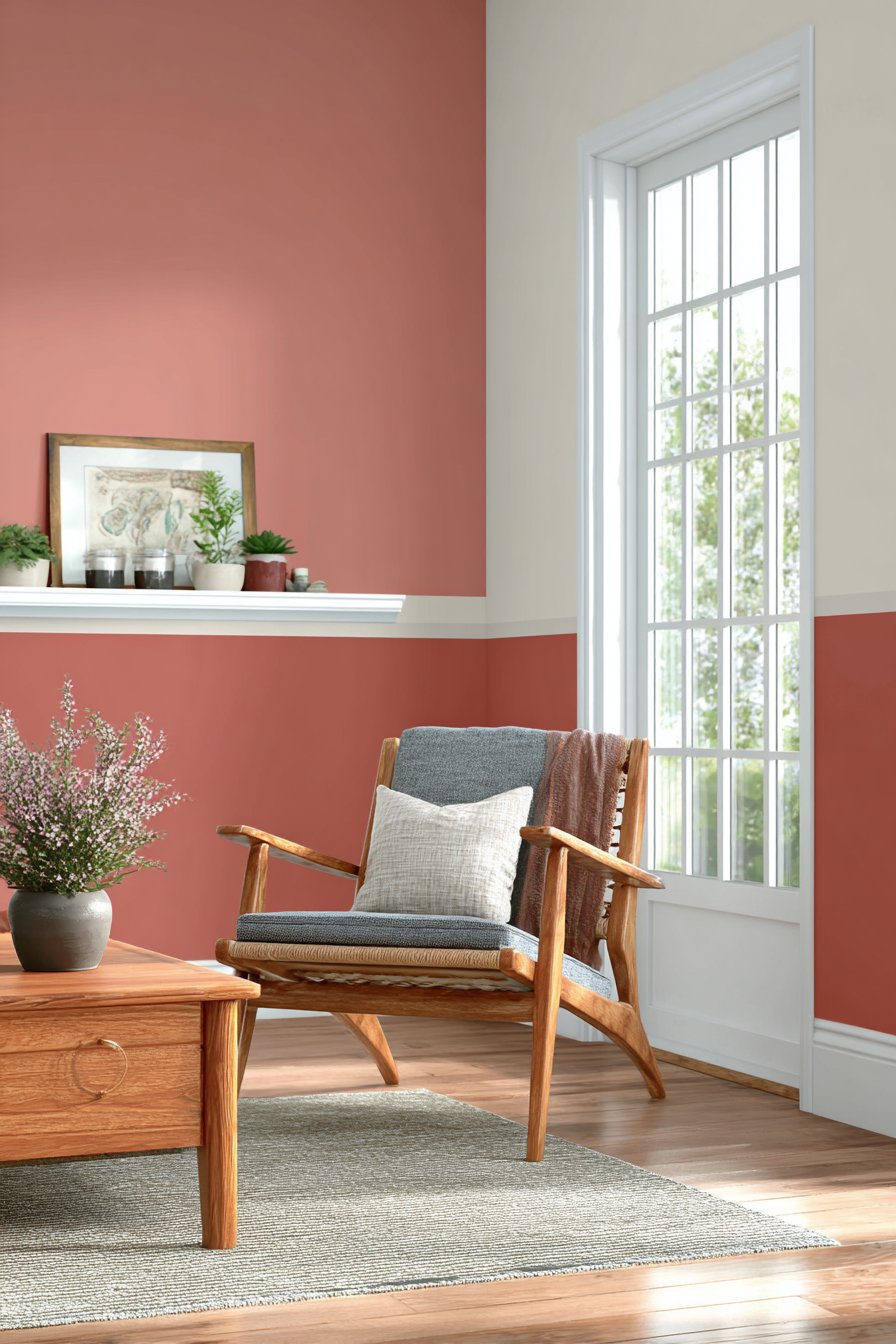 The color division creates several design benefits simultaneously. The darker lower section provides visual weight that grounds the room while being more forgiving of scuffs and marks. The lighter upper section maintains brightness and prevents the bold color from overwhelming the space. The horizontal division makes ceilings appear higher while adding visual interest to otherwise plain walls. The technique works particularly well with on-trend colors like terracotta that might feel too intense covering entire rooms but create perfect impact as feature elements.