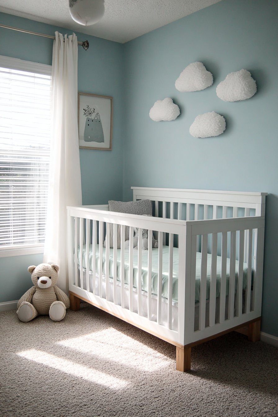 Removable wall decals offer nursery customization that grows with children while respecting rental agreements and future flexibility. This design features whimsical cloud shapes in soft white and gray tones arranged in organic floating pattern above the crib area against pale blue painted walls. The simple shapes create dreamy, peaceful atmosphere without overwhelming the space with intense colors or complex patterns appropriate for infant and toddler spaces.