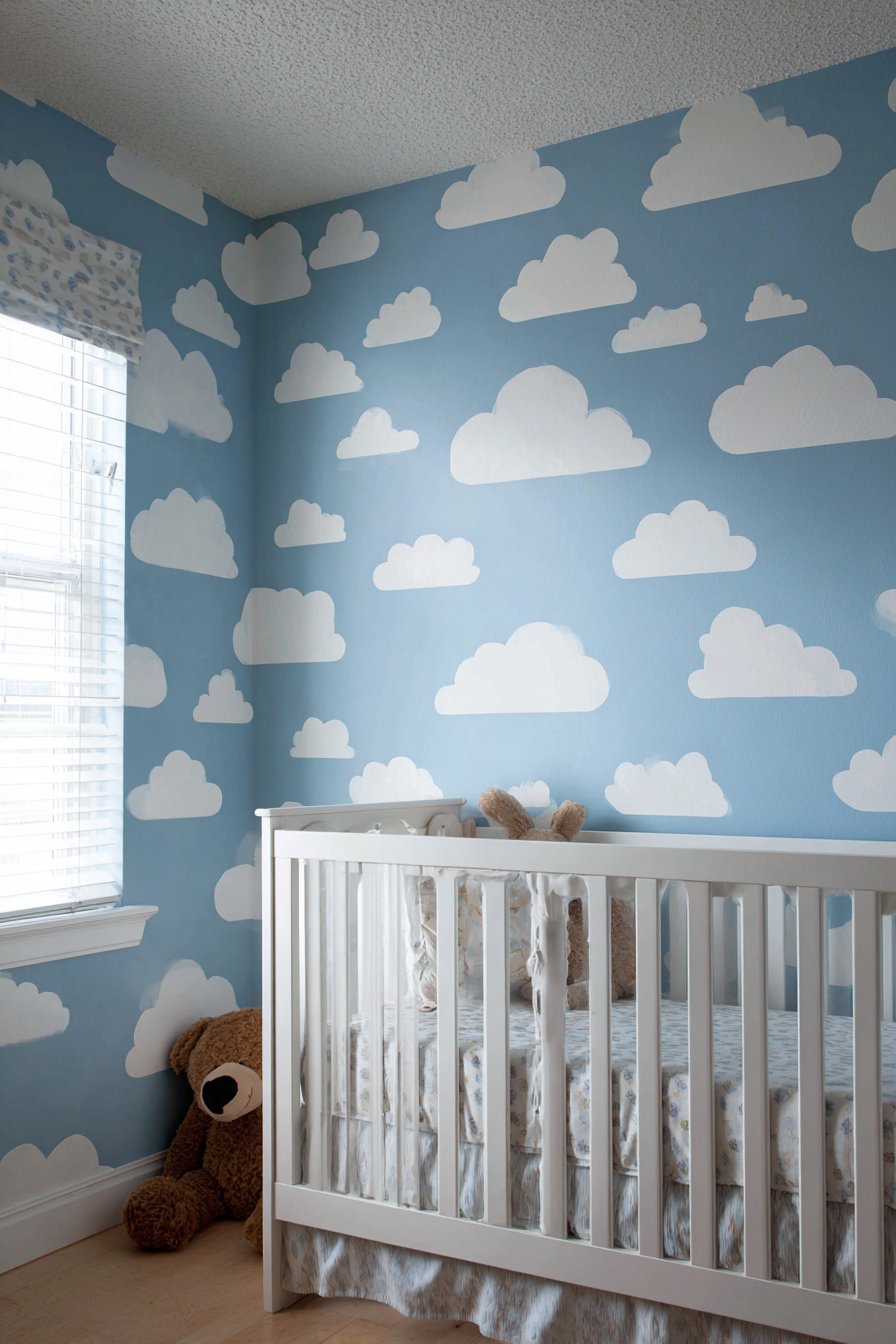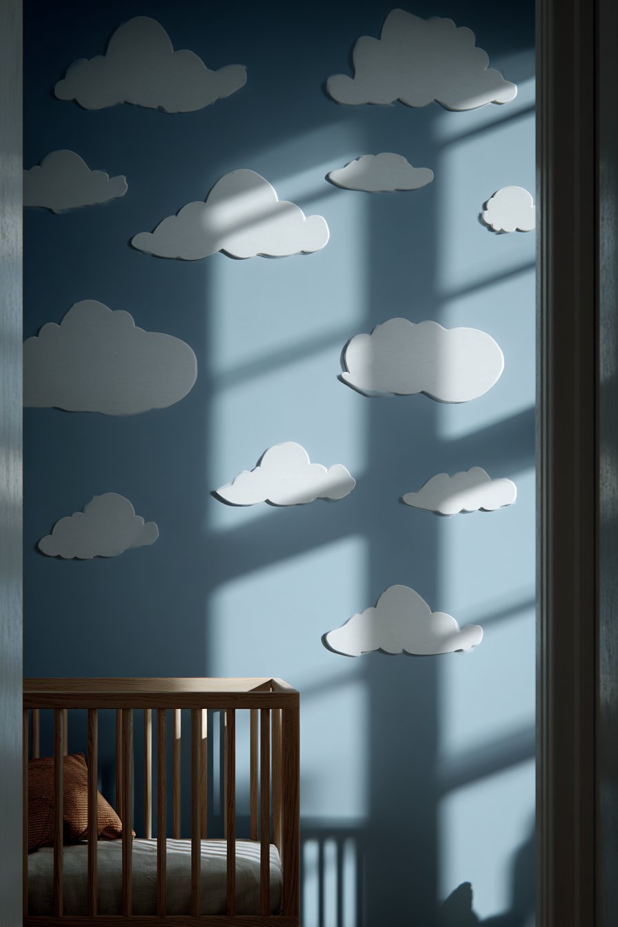 Key Design Tips: Clean walls thoroughly before application to ensure good adhesion. Plan arrangement by cutting cloud shapes from paper first and testing placement with painter’s tape. Apply decals to smooth, painted walls rather than textured surfaces for best adhesion. Use credit card or squeegee to remove air bubbles during application. Avoid placing decals where direct sunlight hits as UV exposure can affect adhesion over time. Choose matte finish decals rather than glossy for more authentic painted appearance. Understand that some paint may lift during removal even with “removable” decals—test in inconspicuous area first. Consider adding small star or moon decals to enhance nighttime sky theme. Remove decals gently by peeling slowly at low angle rather than pulling straight away from wall.