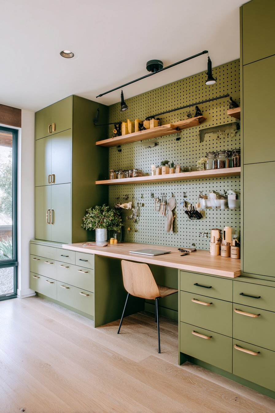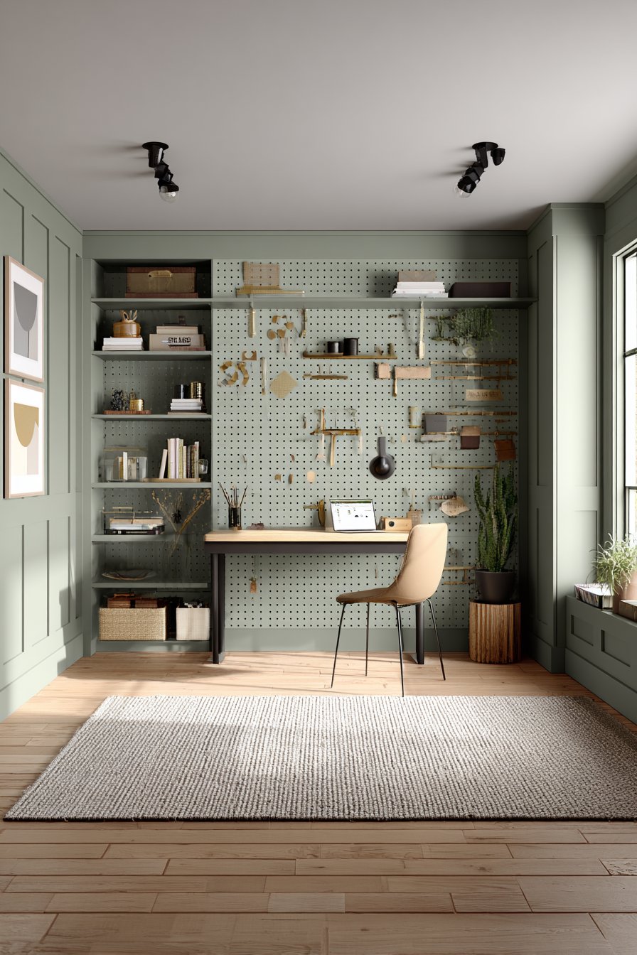 Pegboard systems bring retro-modern functionality to home offices, transforming walls into customizable organizational command centers. This design features floor-to-ceiling pegboard painted in muted sage green, creating visually cohesive backdrop for shelves, hooks, and accessories in coordinated wood and metal finishes. The modular nature allows complete customization and easy rearrangement as work needs and preferences change over time.