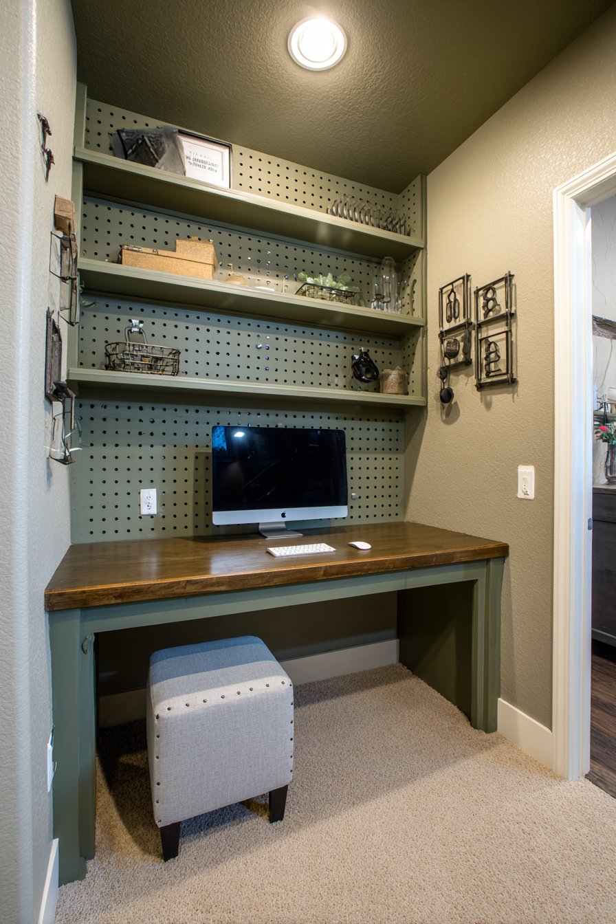 Key Design Tips: Use 1/4-inch pegboard for standard hooks and accessories with proper weight capacity. Mount pegboard on furring strips or spacers to create necessary gap behind panel for hook insertion. Paint pegboard with primer first for smooth finish and better paint adhesion. Plan accessory placement before drilling into walls to avoid creating unnecessary holes. Choose commercial pegboard accessories with proper grip designed for 1/4-inch holes. Install pegboard across entire wall rather than small section for maximum functionality and visual impact. Coordinate accessory colors and materials for cohesive appearance. Include task lighting above or beside pegboard to eliminate shadows when working. Consider magnetic accessories for steel pegboard for maximum organizational flexibility. Use pegboard in closets, laundry rooms, and garages beyond just office spaces.