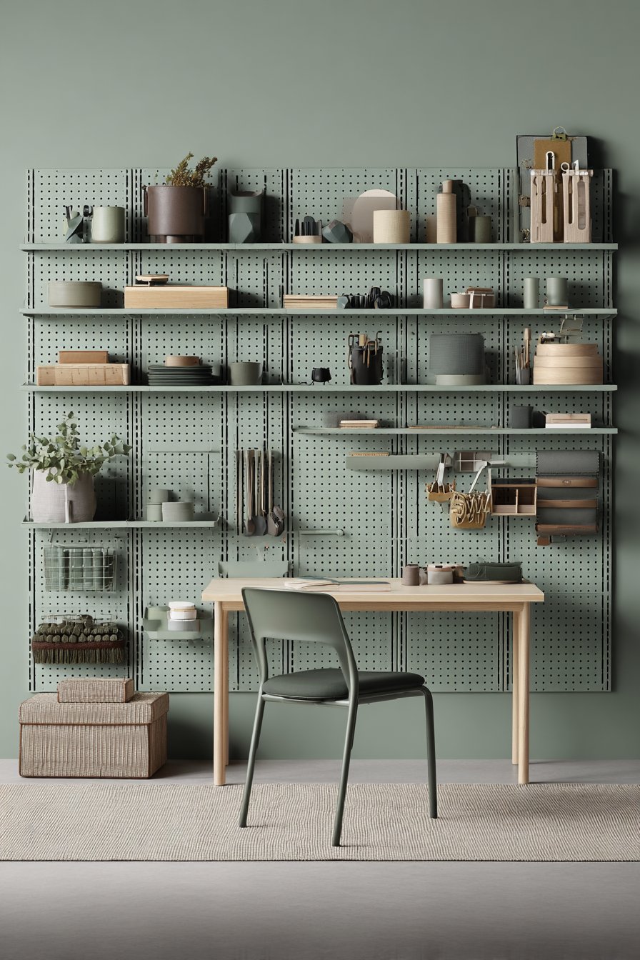 The resurgence of pegboard in contemporary design represents appreciation for functional, honest materials that celebrate utility rather than hiding it. The evenly spaced holes create subtle pattern that adds visual interest even without accessories, while the countless attachment options provide organizational flexibility impossible with traditional shelving. The sage green paint updates the utilitarian material, making it feel intentional and designed rather than garage-workshop afterthought.