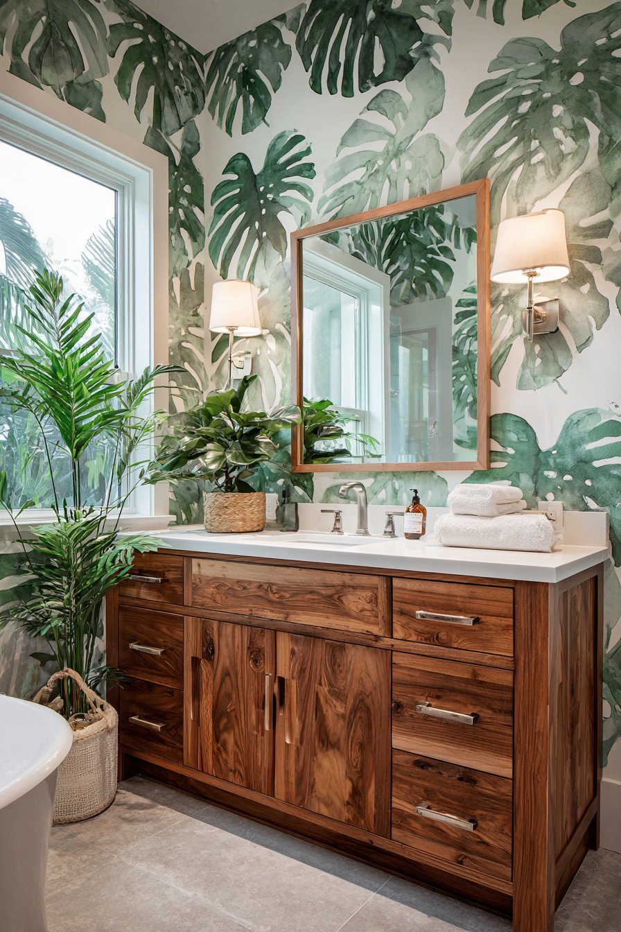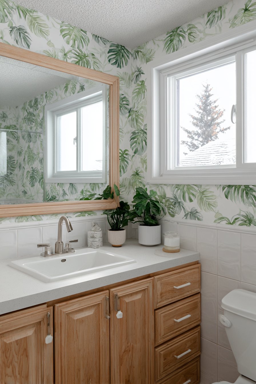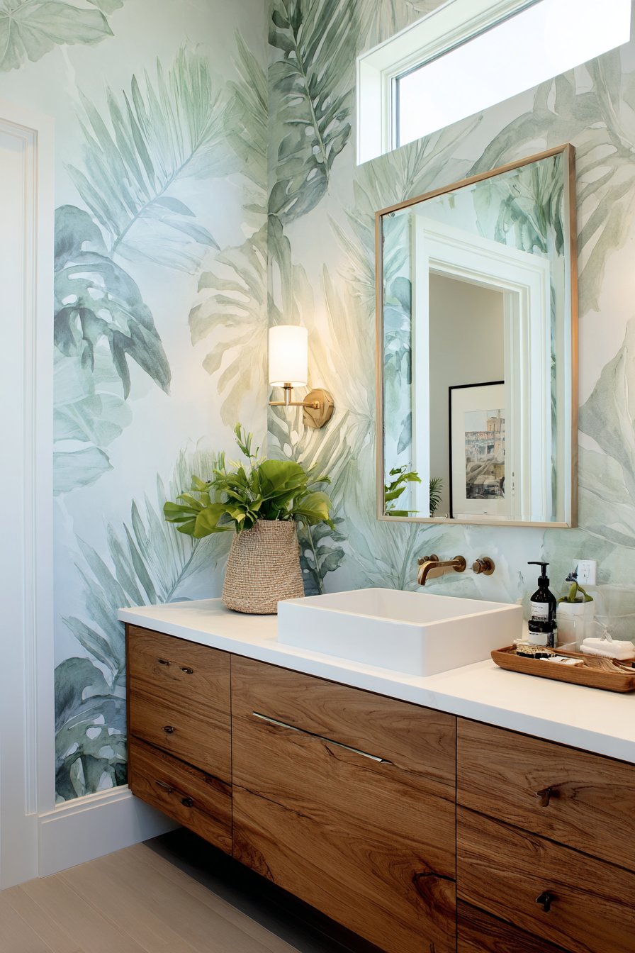 The single accent wall application prevents the bold pattern from overwhelming small bathroom spaces. By keeping other walls and surfaces in coordinating solids—white fixtures, natural wood elements—the wallpapered wall becomes clear focal point without creating visual chaos. The nature-inspired theme pairs naturally with plants, natural materials, and organic textures, creating cohesive design that feels intentional and harmonious.