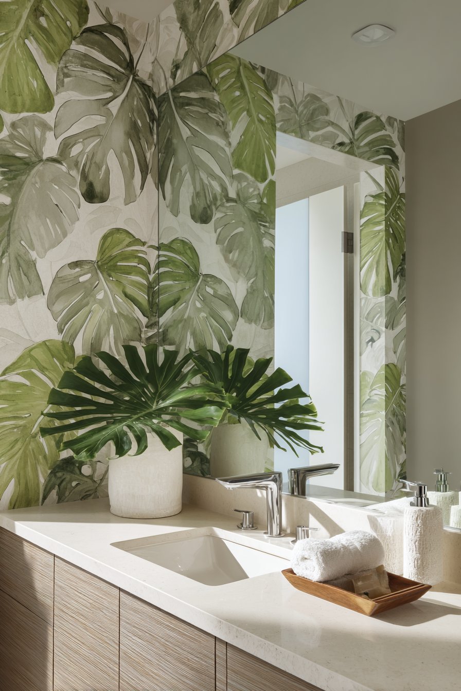Large-scale botanical wallpaper brings nature indoors while creating dramatic focal points in bathrooms and powder rooms. This design features watercolor-style oversized monstera leaves in soft greens and grays on white background, creating tropical yet sophisticated atmosphere that feels fresh and contemporary. The artful rendering—painterly rather than photographic—adds artistic quality that elevates the wallpaper from decoration to artwork.