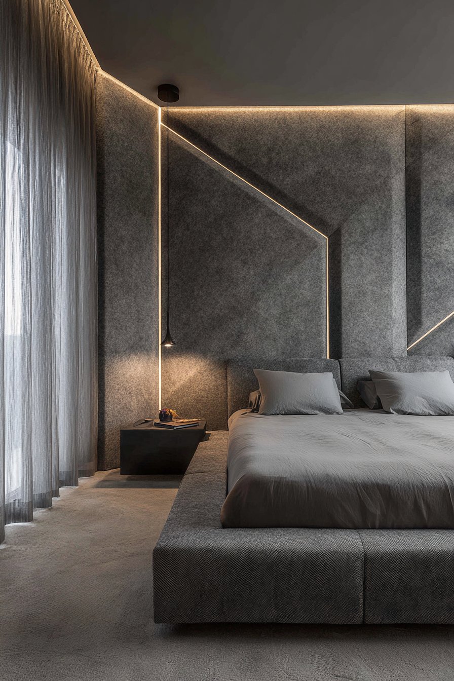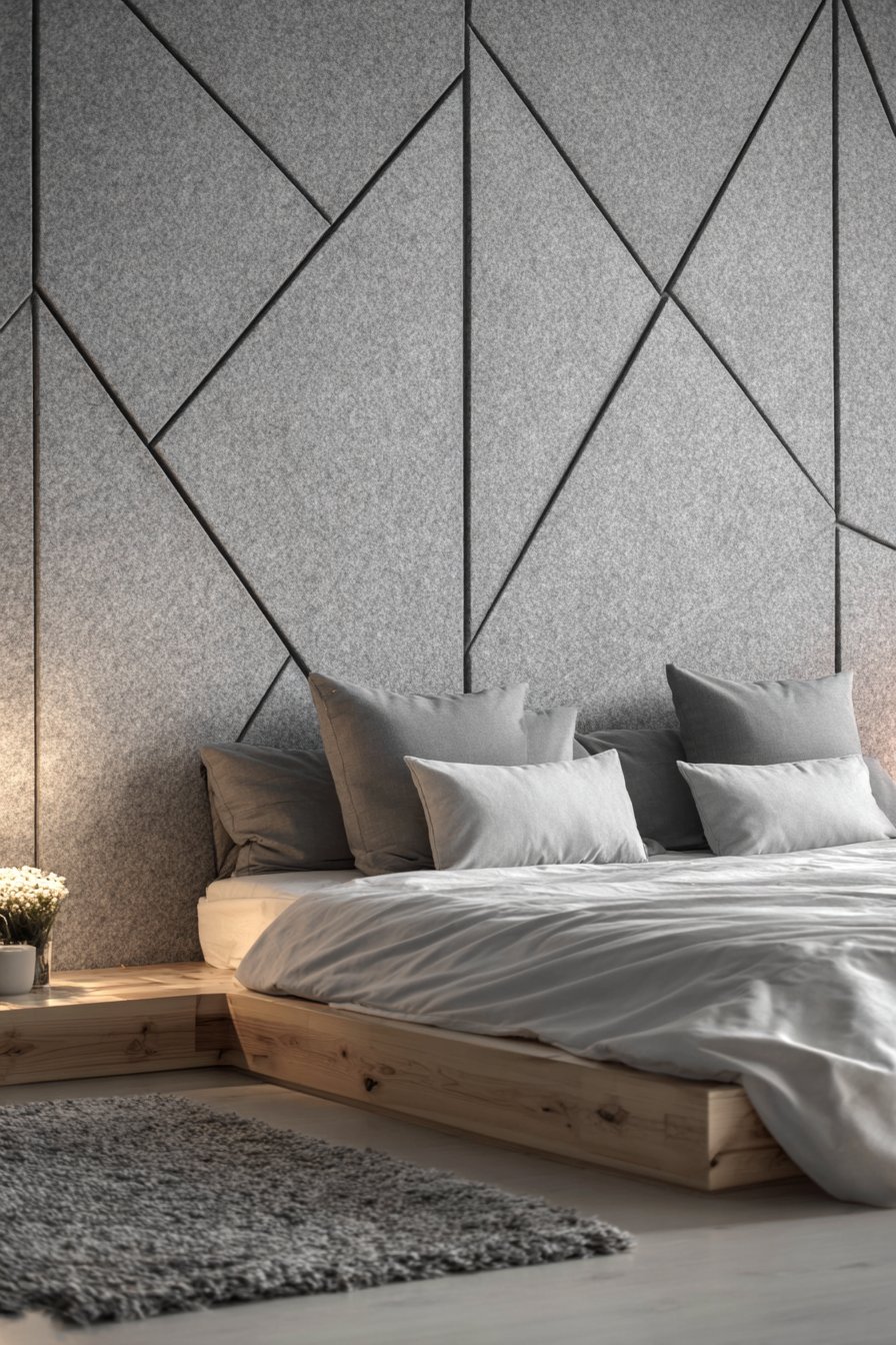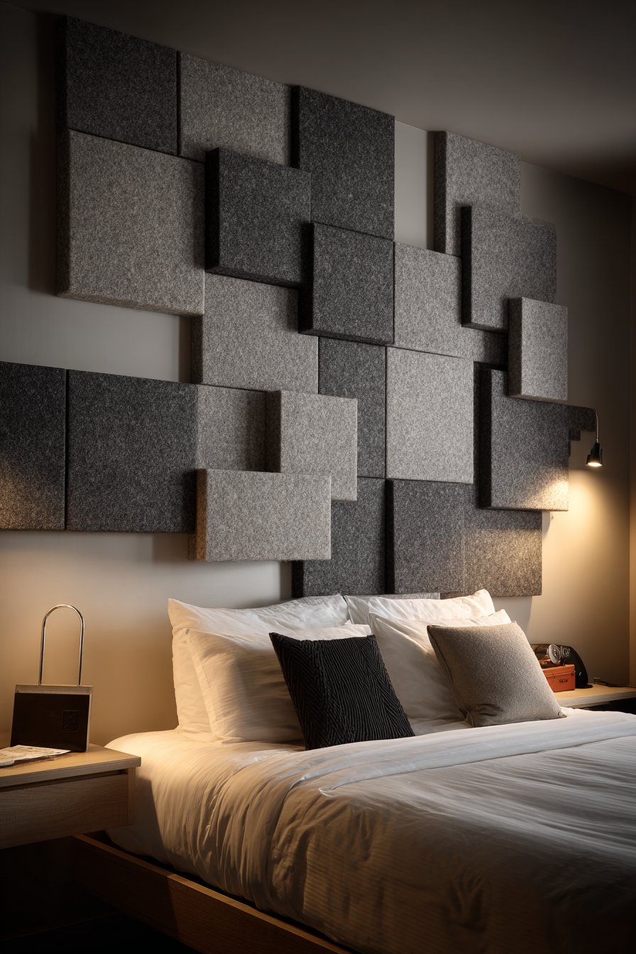 Acoustic panels represent the convergence of form and function, solving sound quality issues while serving as intentional design elements. This design features charcoal gray wool felt panels arranged in geometric pattern on the bedroom wall behind the bed. The practical panels, mounted with minimal visible hardware, provide sound dampening that reduces echo and ambient noise while creating modern artistic installation that enhances rather than detracts from the room’s aesthetic.