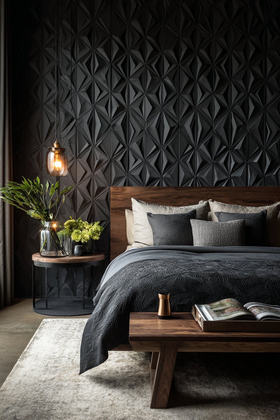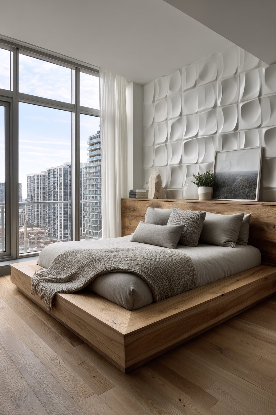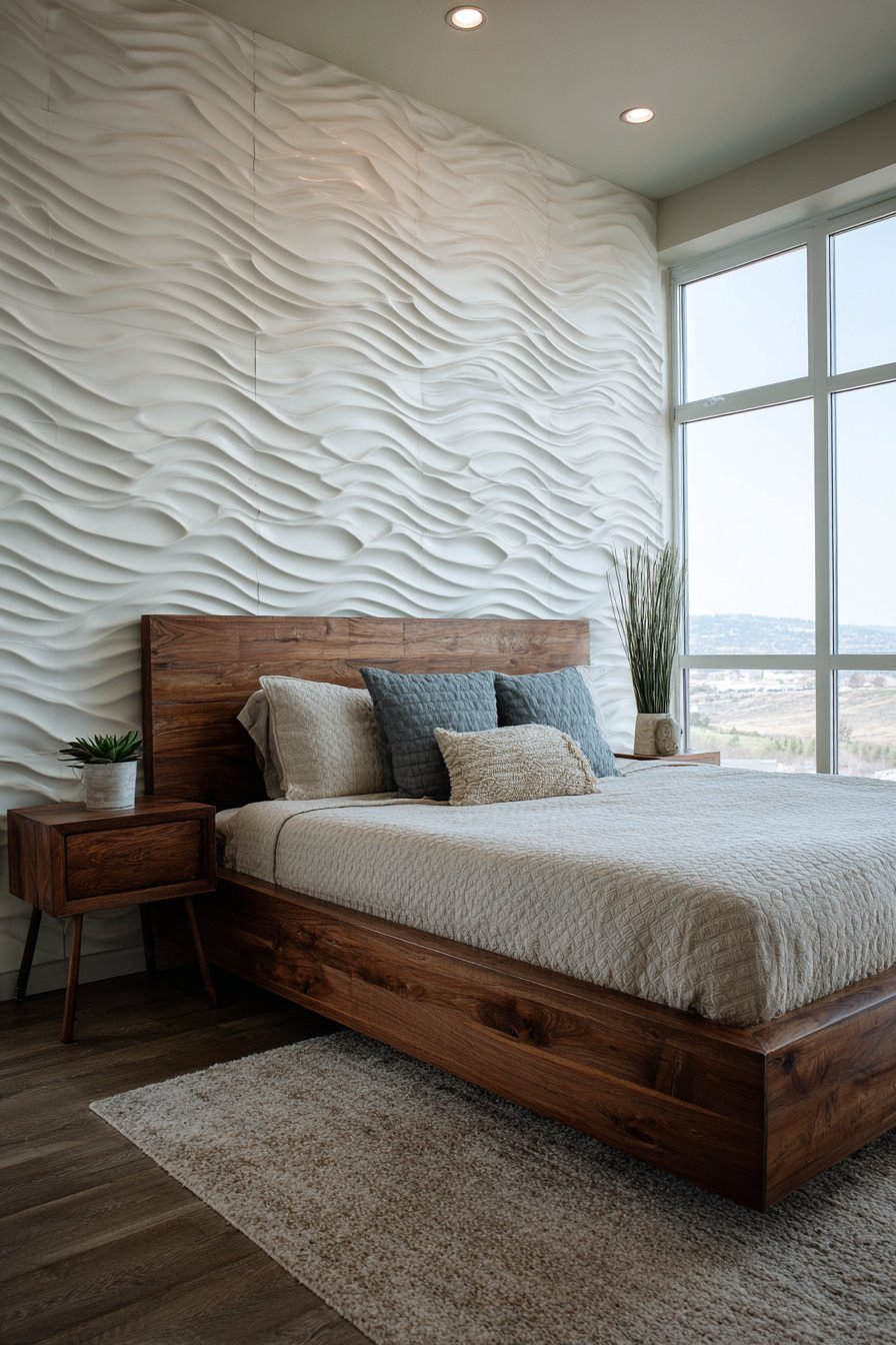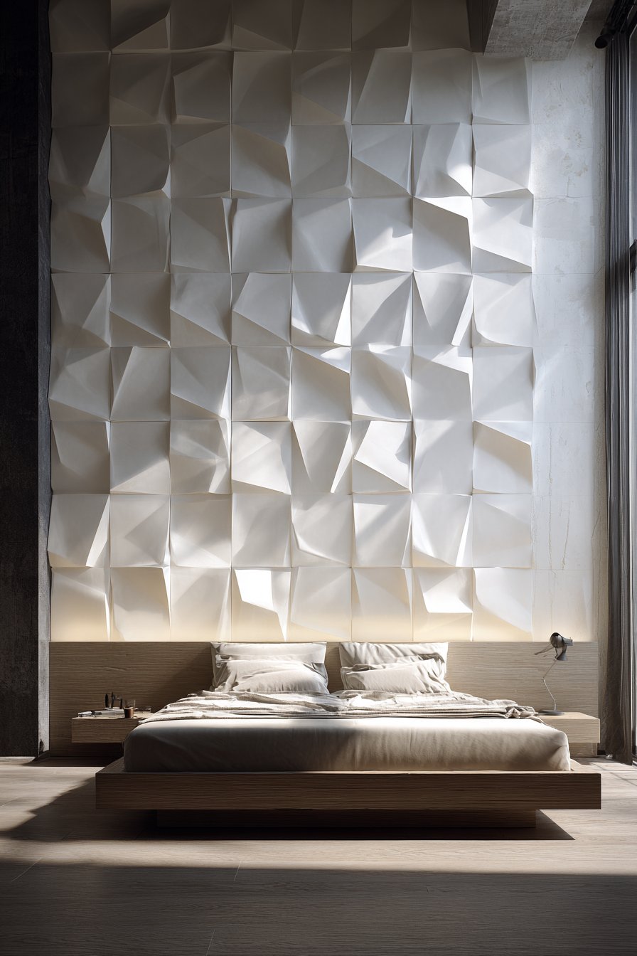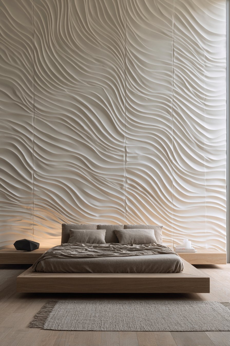 Three-dimensional wall panels represent the cutting edge of wall design, transforming flat surfaces into sculptural installations that create ever-changing shadow patterns throughout the day. This design features geometric wave-pattern panels in matte white, creating dimensional ripples across the entire headboard wall. The panels cast subtle shadows that shift with natural light movement, adding dynamic visual interest that painted or wallpapered surfaces cannot achieve.