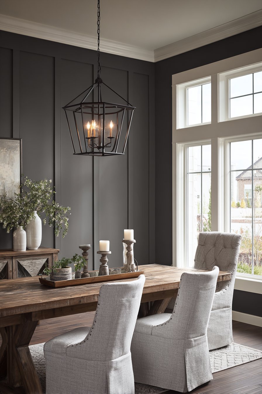 Board and batten wall treatments bring timeless architectural character to any dining space, creating the impression of craftsmanship and attention to detail. This design features vertical battens in deep charcoal gray, precisely spaced to create rhythmic vertical elements that add sophisticated dimension. The crisp white crown molding at the top provides classic contrast while defining the upper boundary of the treatment and connecting it visually to the ceiling plane.