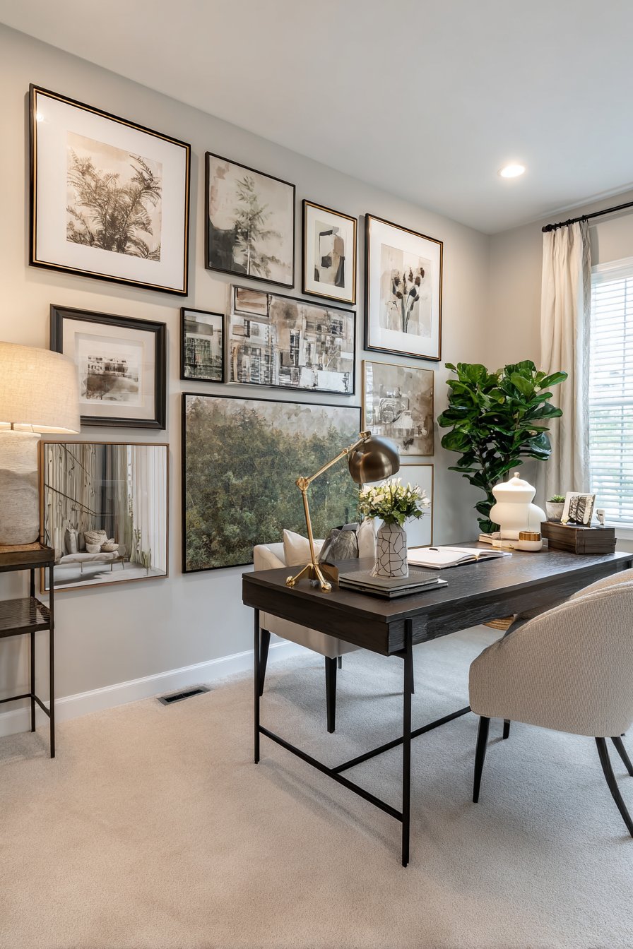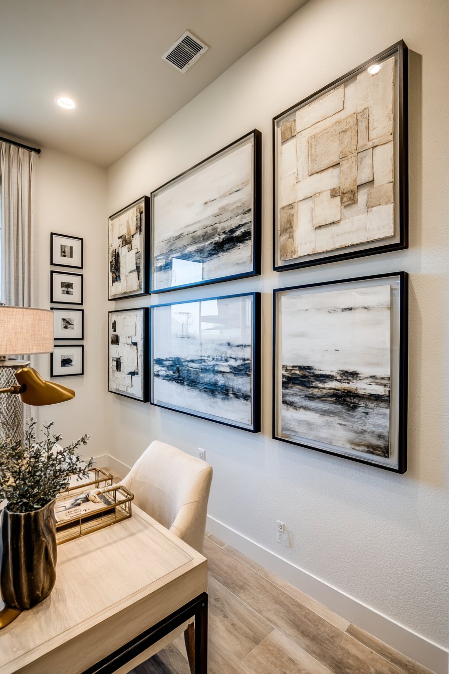 The practical beauty of gallery walls lies in their flexibility and accessibility. This approach works equally well with valuable original art, affordable prints, family photographs, or personal collections. The arrangement can evolve over time, with pieces being swapped or added as your collection grows. When positioned above a desk in a home office, a gallery wall creates an inspiring backdrop that personalizes the workspace and provides visual interest during video calls.