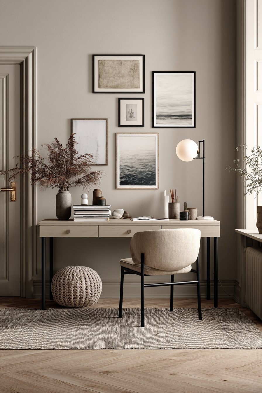 The gallery wall represents a highly personal form of wall design, transforming a blank surface into a visual autobiography that reflects your interests, travels, and aesthetic sensibilities. This design features mixed media artwork in coordinating black frames of varying sizes, arranged in an intentional asymmetrical layout that creates visual interest while maintaining overall balance. The light greige painted background provides neutral canvas that allows the artwork to command attention without competing backgrounds.