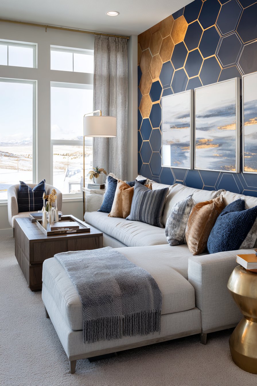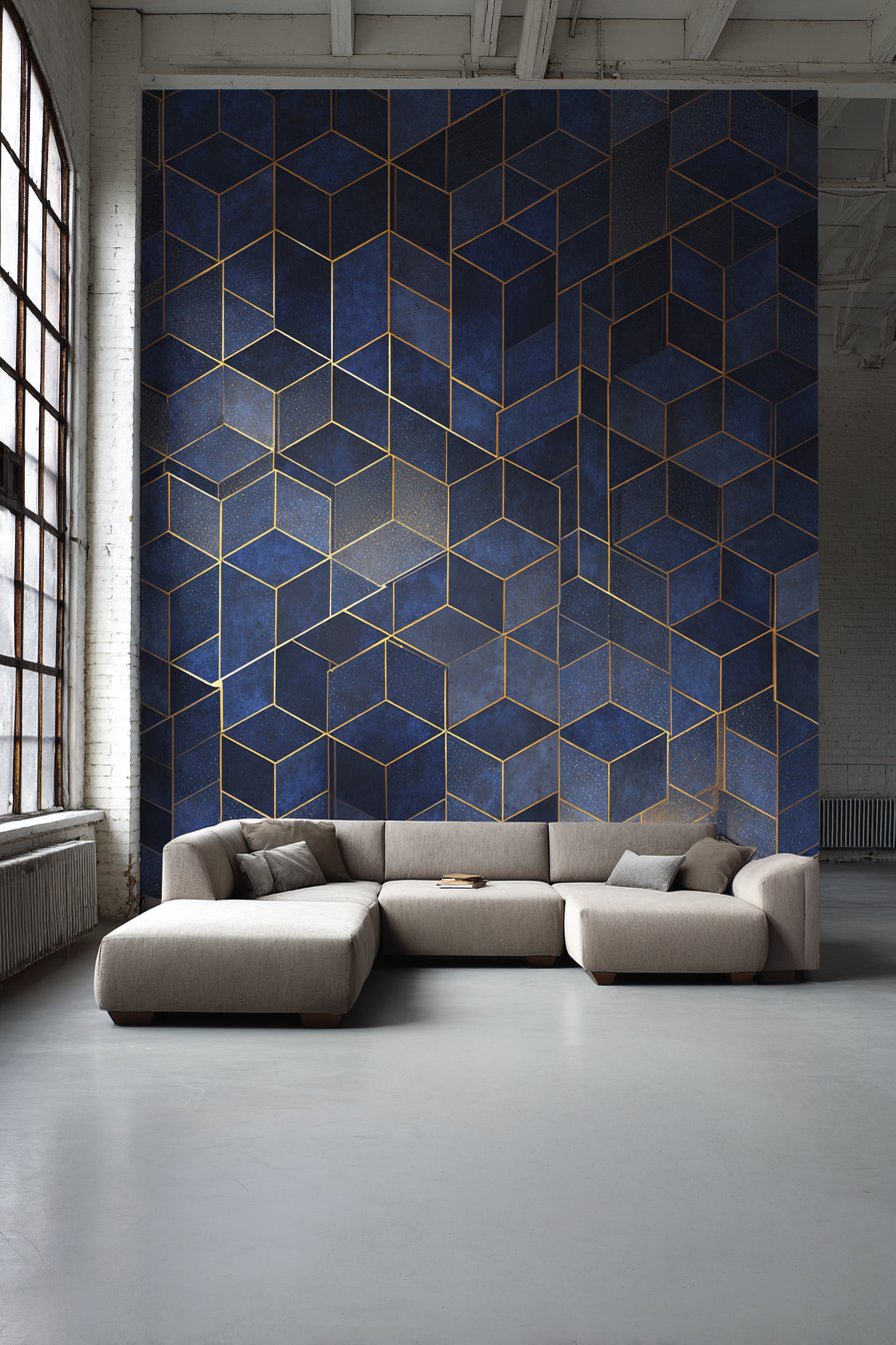 The hexagonal pattern provides several layers of visual interest—the geometric shape itself creates modern sophistication, the navy blue introduces bold color that anchors the room, and the gold metallic elements catch light dynamically throughout the day, adding subtle glamour and movement. This combination works particularly well in living spaces where you want to establish a contemporary aesthetic with luxurious undertones. The pattern’s medium scale prevents it from feeling too busy while remaining visually significant from across the room.
