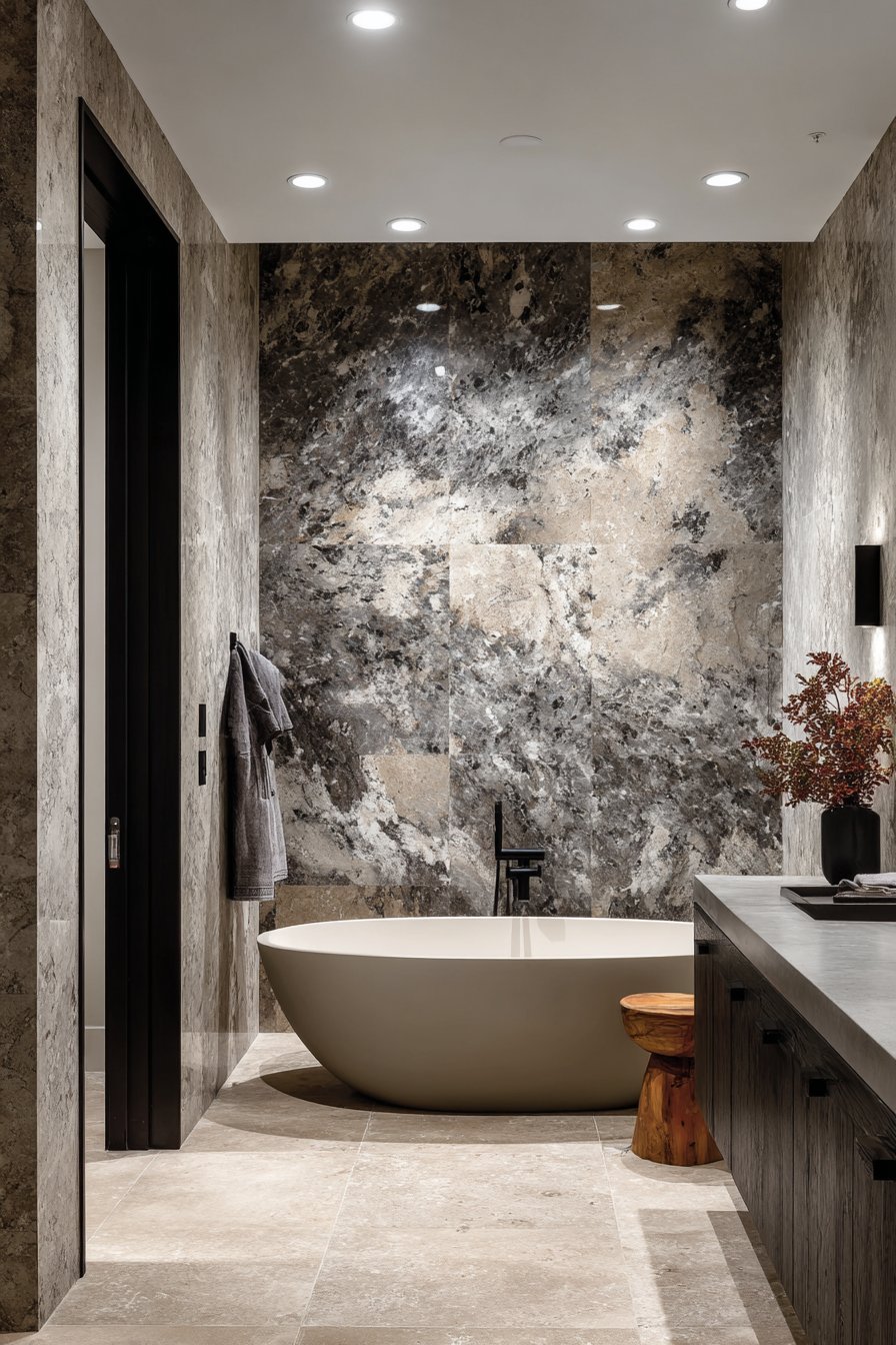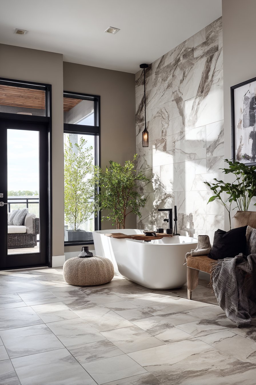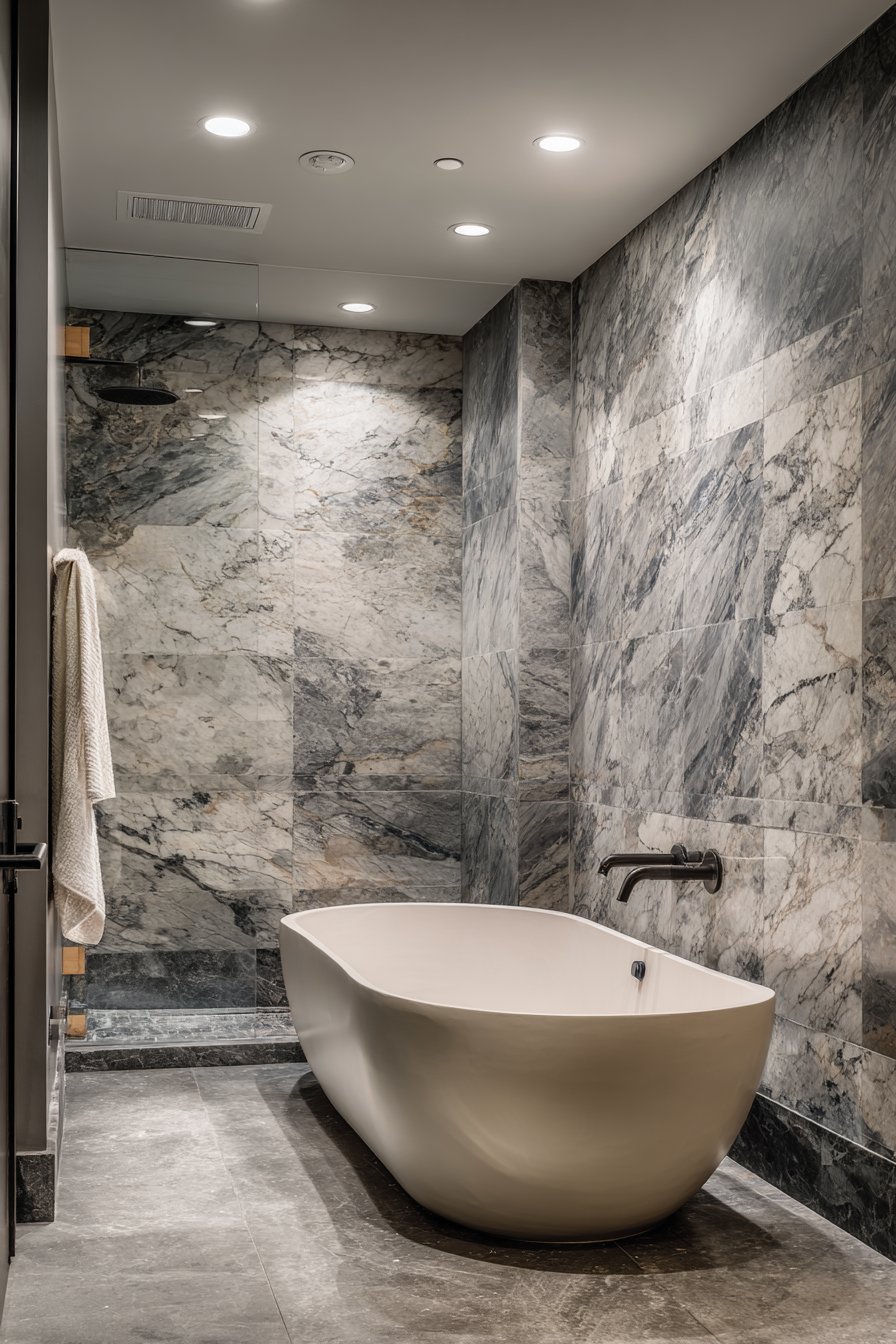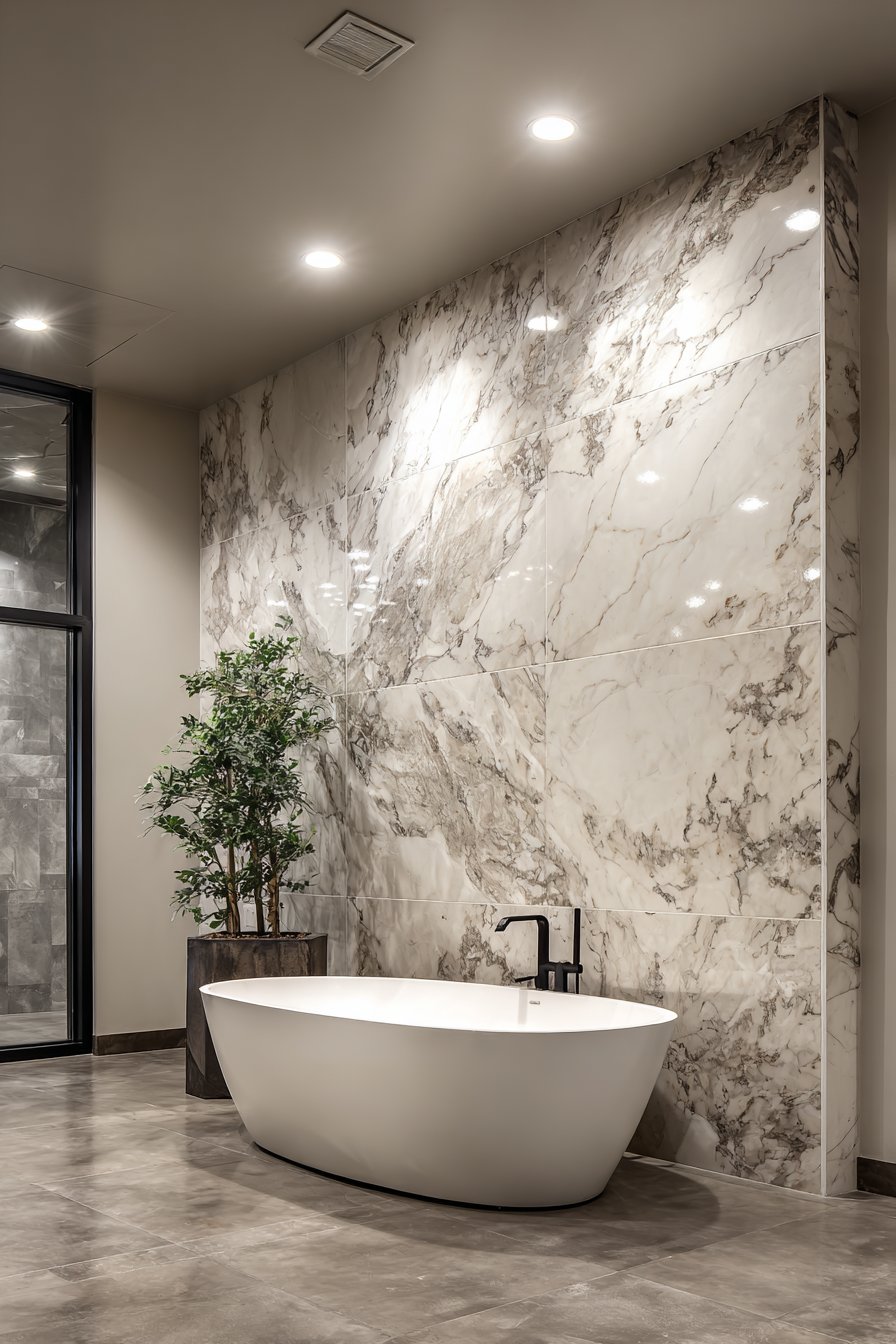Large-format porcelain tiles in book-matched marble patterns bring spa-like luxury to bathroom spaces, creating dramatic focal walls that elevate the entire room. This design features tiles arranged to mirror their veining patterns, creating the illusion of continuous natural stone slabs with gray and white veining flowing seamlessly across the wall surface. The floor-to-ceiling installation behind a freestanding soaking tub creates a statement backdrop that transforms an everyday bathroom into a personal sanctuary.