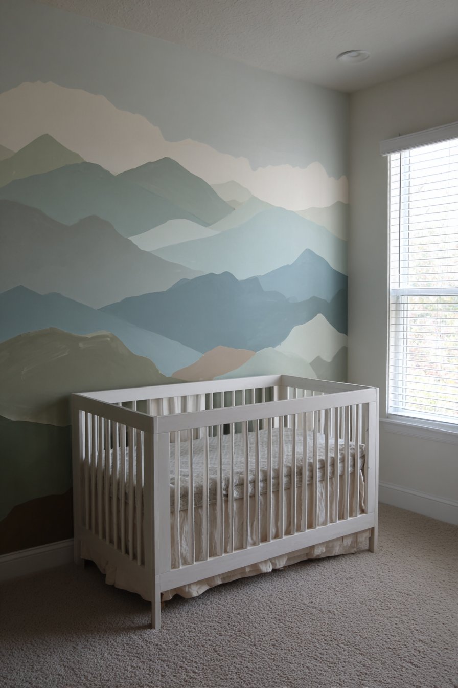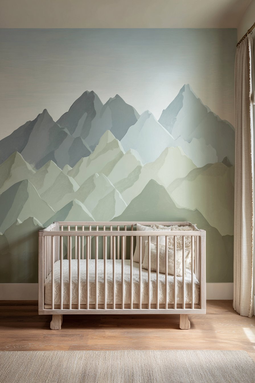 Artistic wall murals offer unique opportunities to introduce personality and whimsy into children’s spaces while maintaining sophisticated aesthetics that parents appreciate. This design features a hand-painted mountain landscape in soft sage green, dusty blue, and warm taupe tones, creating gentle peaks with subtle color gradients that evoke nature without overwhelming the senses. The painterly quality and muted palette ensure the mural reads as artistic rather than cartoonish, creating a serene environment conducive to rest and imagination.
