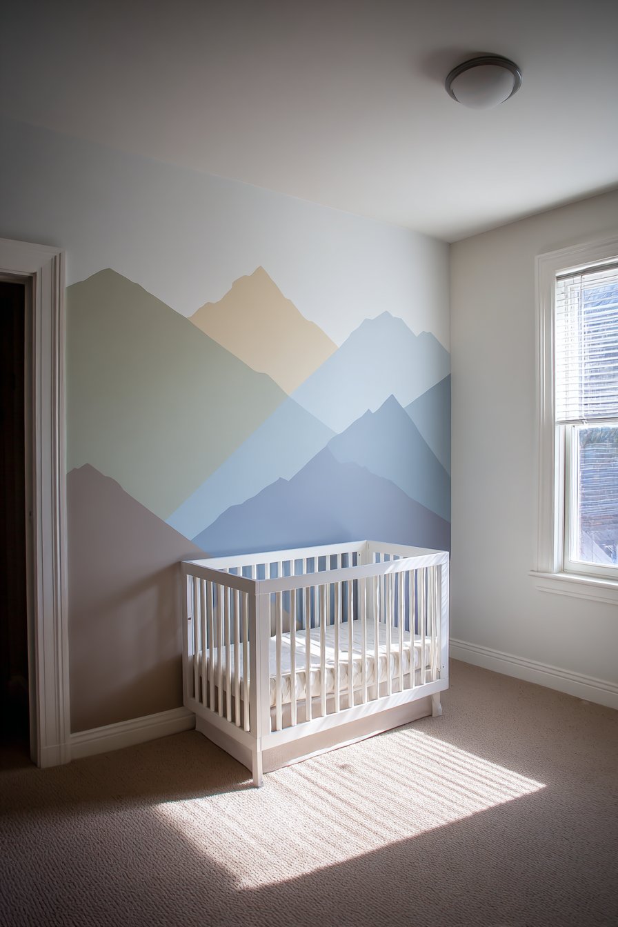 Key Design Tips: Start with a light pencil sketch to establish mountain proportions and positioning. Use a sea sponge or stippling brush to create soft, blended color transitions. Layer colors gradually from light to dark for depth and dimension. Practice painting technique on poster board before committing to walls. Use low-VOC or zero-VOC paints in nurseries and children’s rooms. Consider adding subtle details like tiny trees or clouds with fine brushes. Apply matte finish paint to avoid distracting reflections. Create template mountains on cardboard to test composition before painting. Extend mural slightly beyond crib wall for wraparound effect if desired.