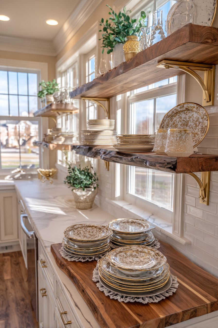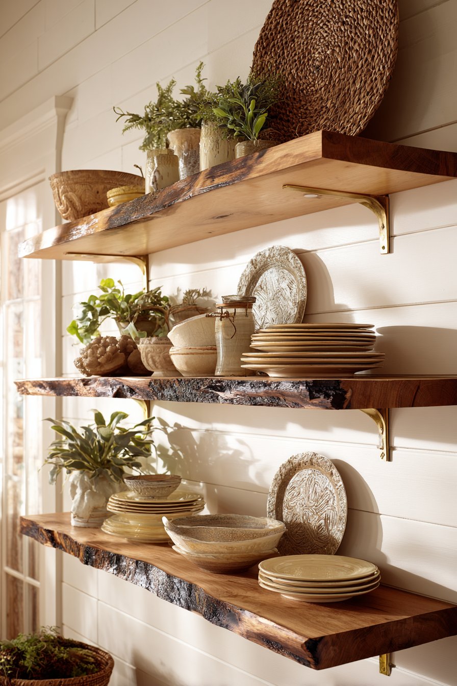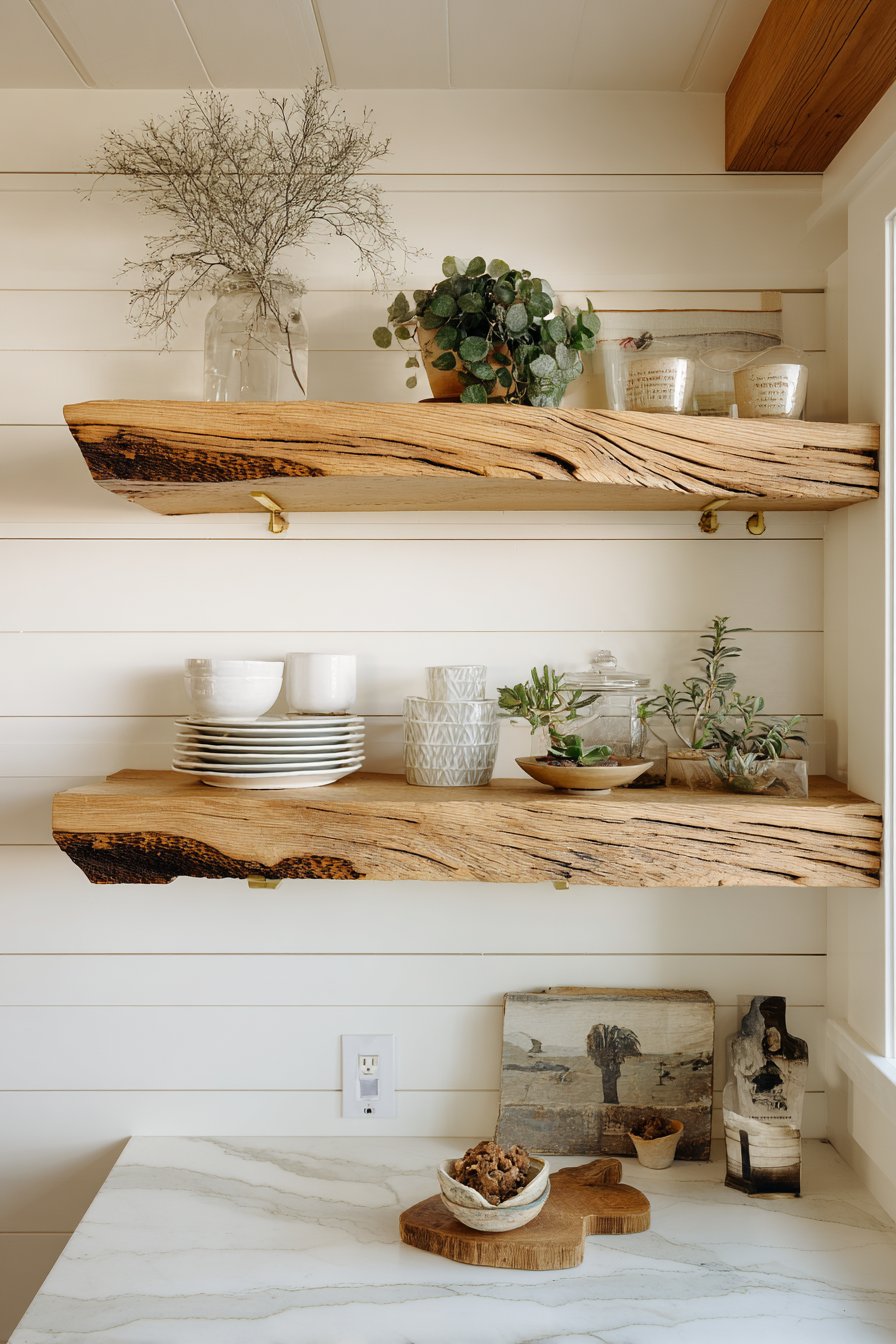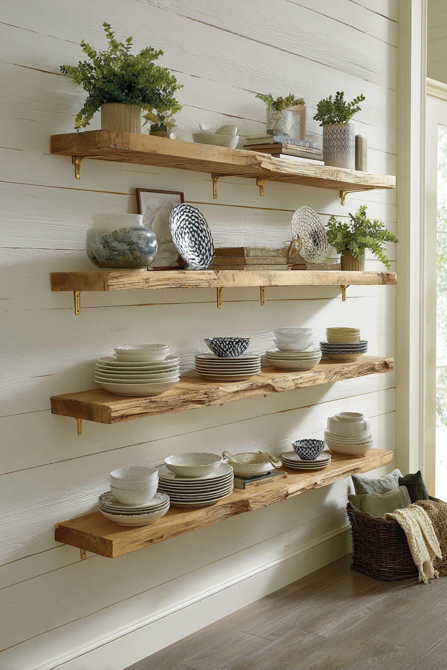 Open shelving transforms walls into functional art displays while providing practical storage solutions. This design features floating shelves crafted from reclaimed wood with natural edge detail, mounted on white shiplap accent walls that provide textured backdrop. The shelves display coordinated dishware, potted plants, and curated decorative objects in organized arrangements that balance aesthetics with accessibility. Brass shelf brackets add industrial-chic accent while providing necessary structural support.