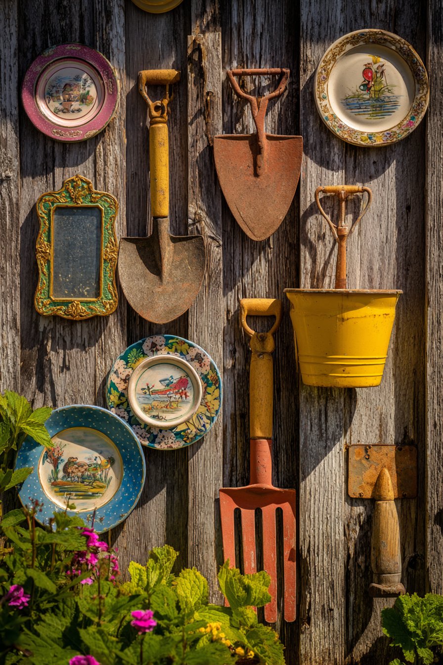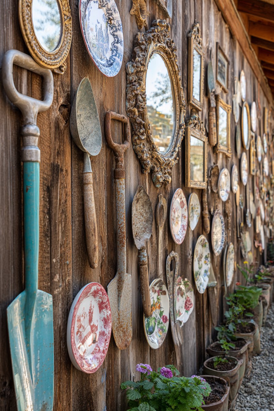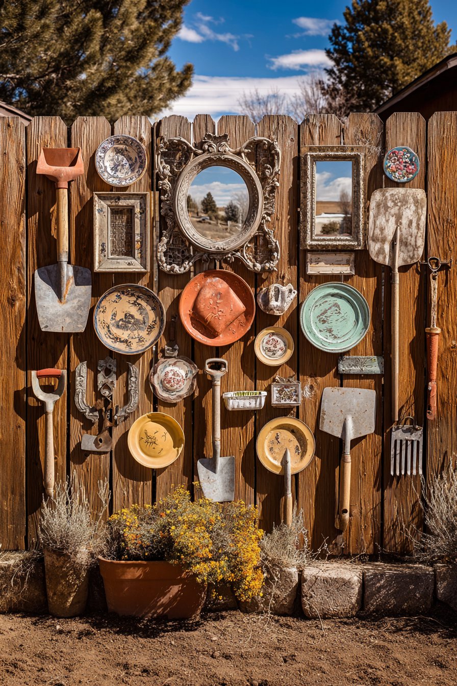 Personality and patina combine in this collected-over-time approach that celebrates individual taste through curated vintage finds. A natural cedar fence serves as the backdrop for an asymmetrical arrangement of vintage garden tools, antique mirrors with ornate frames, and colorful ceramic plates that might have graced European dining tables decades ago. Each piece earns its place through authentic age, interesting form, or personal significance—this isn’t random clutter but thoughtful curation that tells the homeowner’s story. The asymmetry feels intentional, with larger elements anchoring the composition while smaller pieces create movement and connection between focal points.