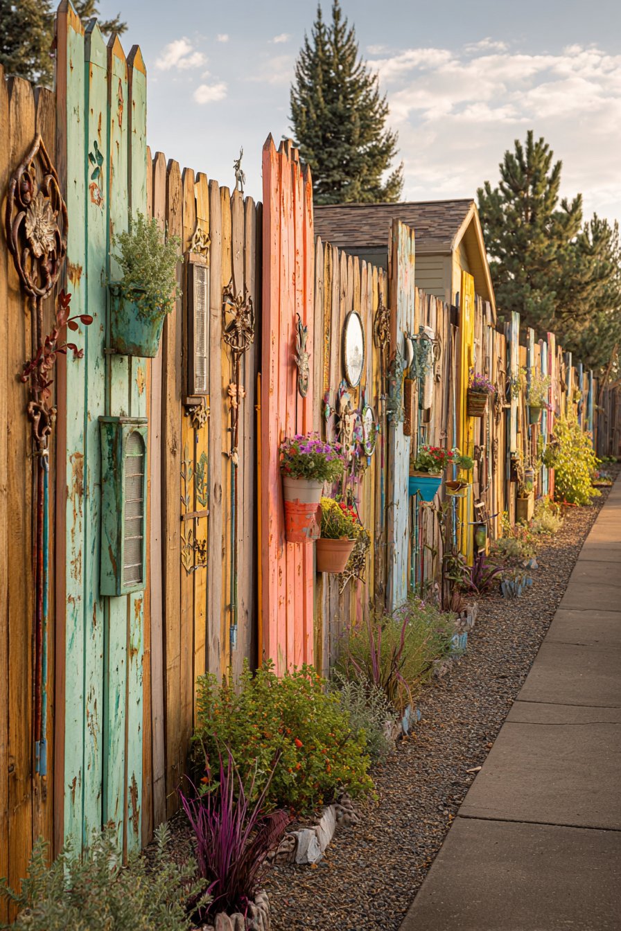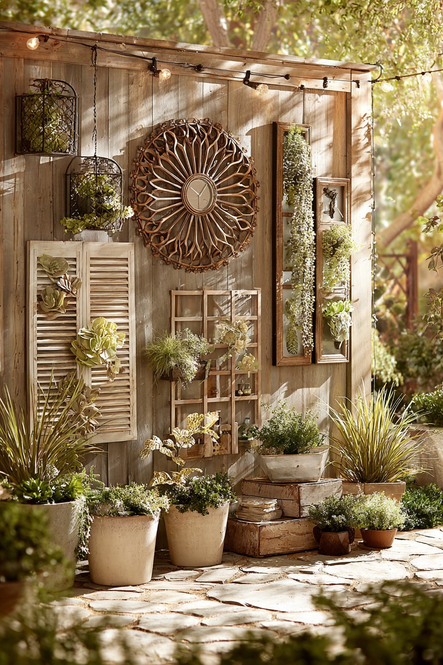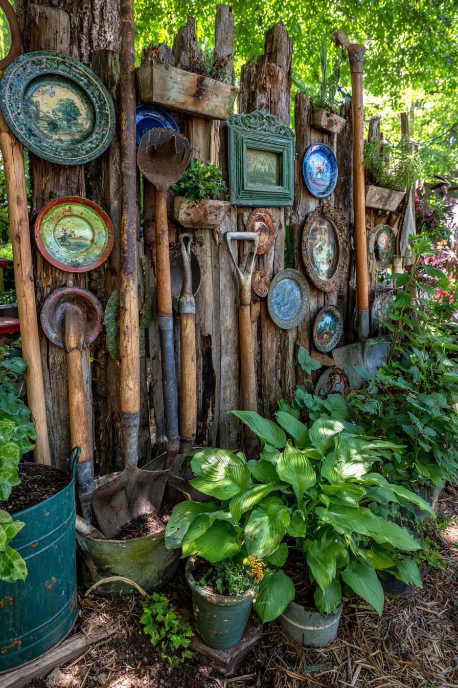 Personality and patina combine in this collected-over-time approach that celebrates individual taste through curated vintage finds. A natural cedar fence serves as the backdrop for an asymmetrical arrangement of vintage garden tools, antique mirrors with ornate frames, and colorful ceramic plates that might have graced European dining tables decades ago. Each piece earns its place through authentic age, interesting form, or personal significance—this isn’t random clutter but thoughtful curation that tells the homeowner’s story. The asymmetry feels intentional, with larger elements anchoring the composition while smaller pieces create movement and connection between focal points.