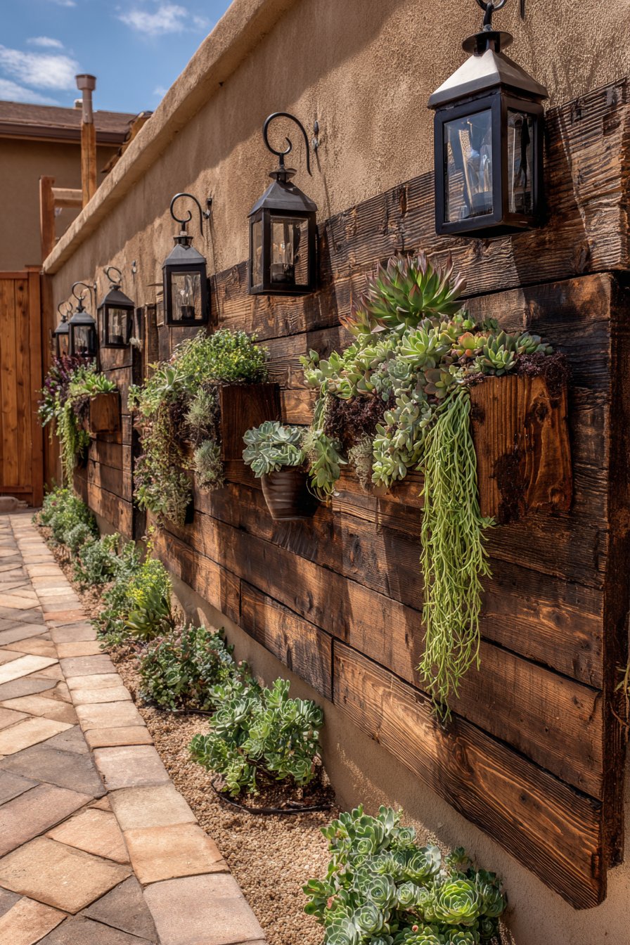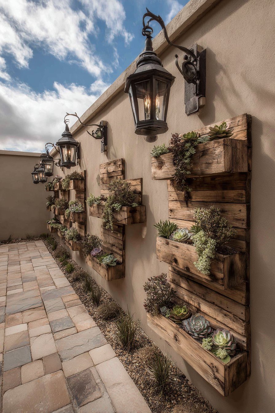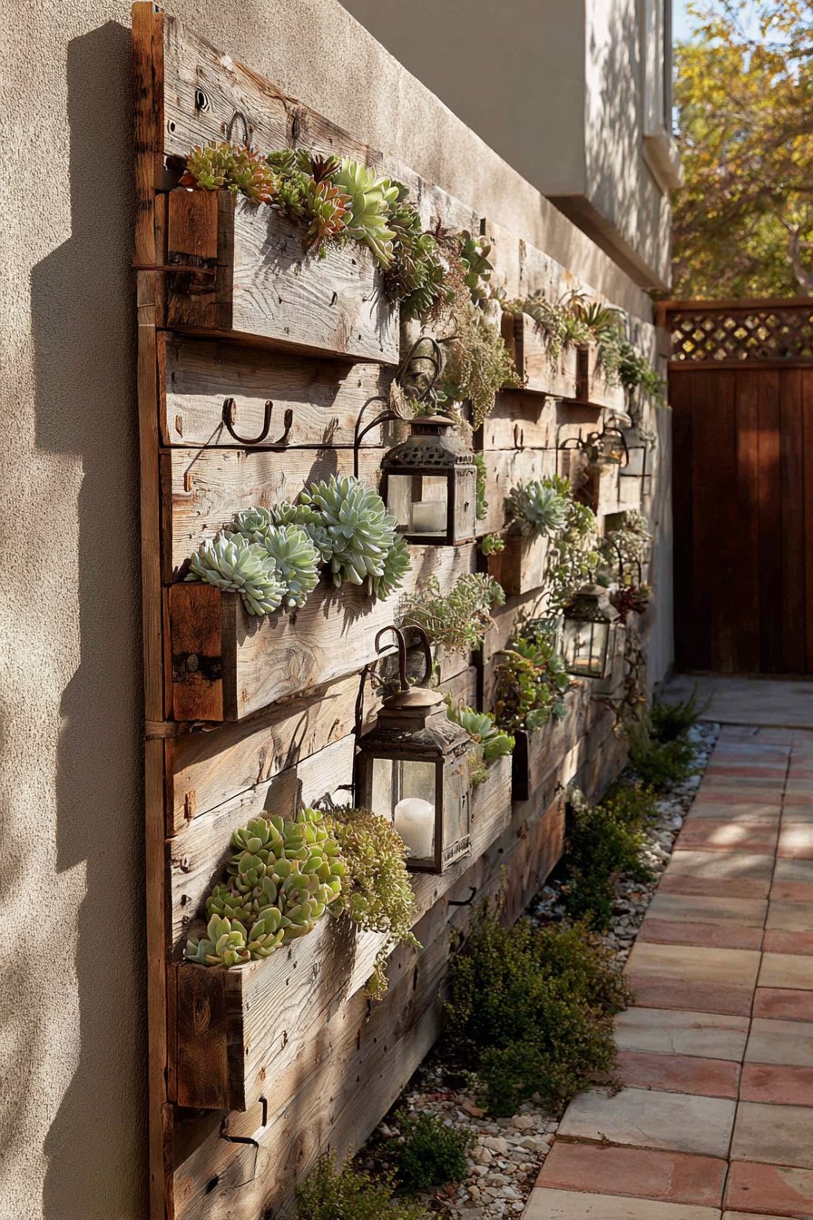 The practical benefits extend beyond aesthetics—vertical gardens improve air quality, provide natural insulation, and create habitats for beneficial insects. The succulent selection ensures low maintenance requirements while offering varied colors, textures, and growth patterns throughout the seasons. Trailing plants like string of pearls or burro’s tail add movement and softness, preventing the geometric structure from feeling too rigid. The lanterns serve dual purposes, functioning as decorative elements during the day and providing ambient lighting for evening entertaining.