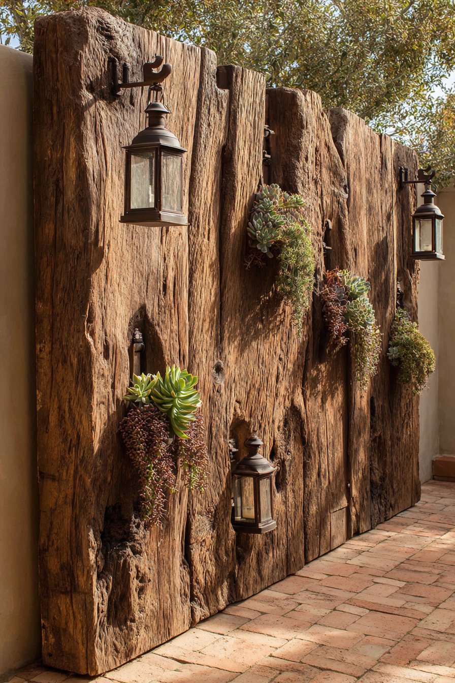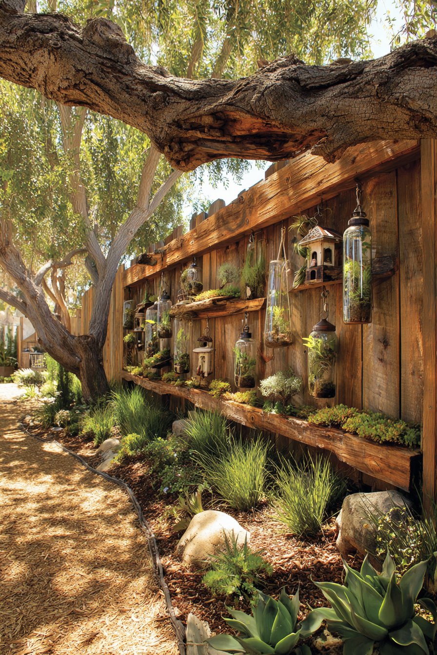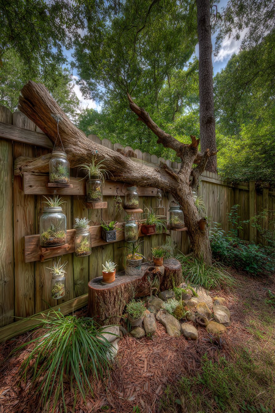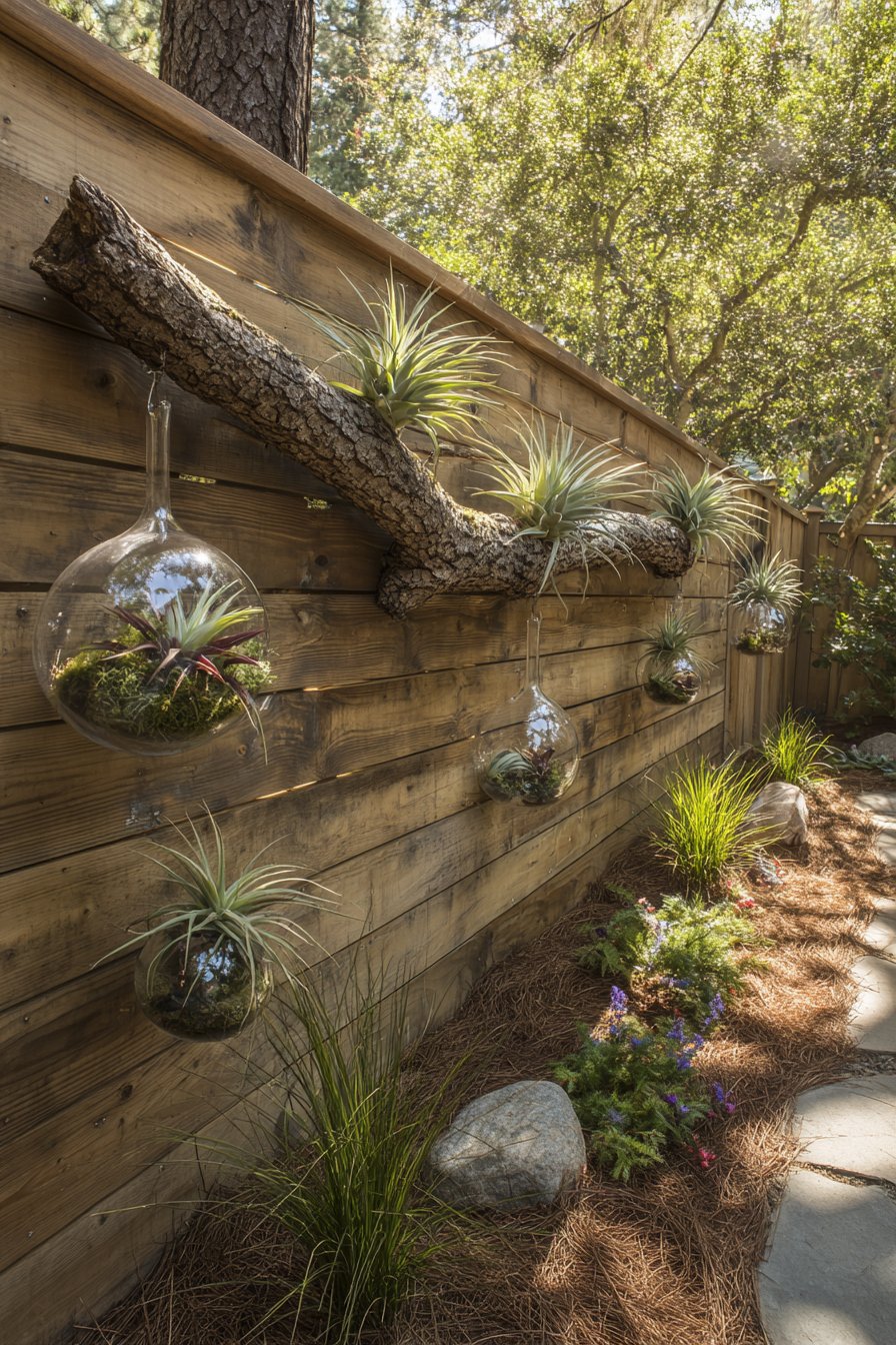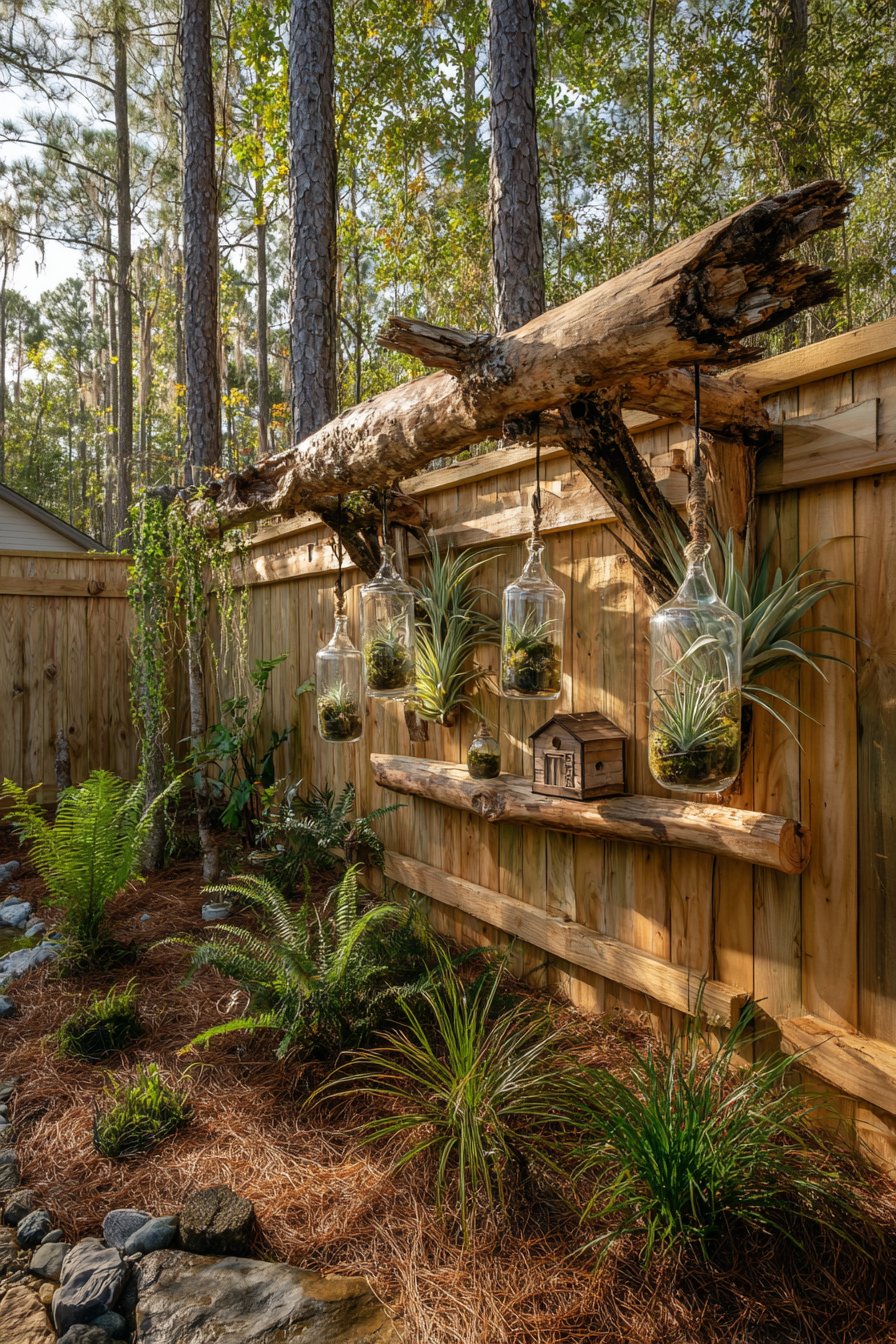 Organic sculptural elements create dramatic focal points through nature’s own artistry when large tree branches become wall-mounted installations. A substantial branch—selected for its interesting form, multiple smaller branches, or dramatic curve—mounts horizontally on a natural wood fence, its bark texture and growth pattern providing intricate detail that no manufactured item could replicate. Hanging glass terrariums contain air plants and moss, their transparent vessels allowing appreciation of plants’ root systems and growth habits while protecting delicate specimens from weather extremes.