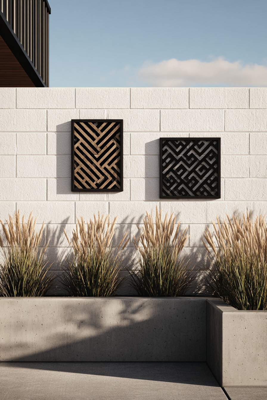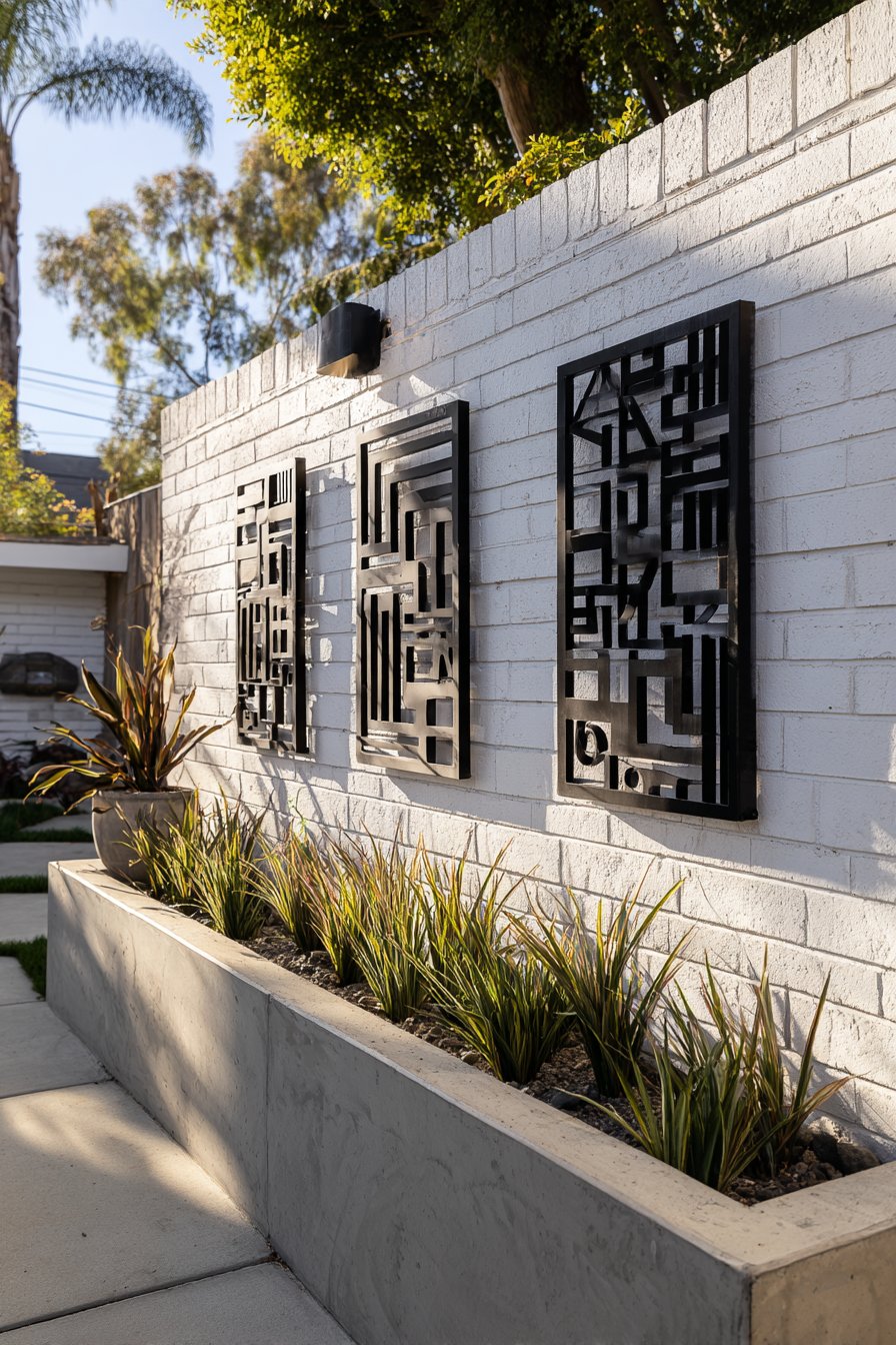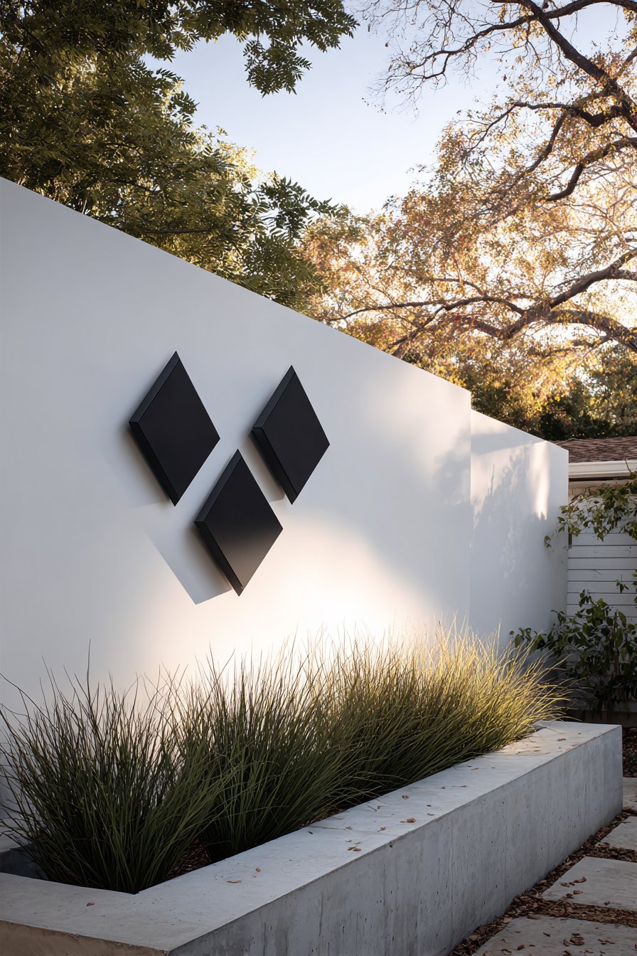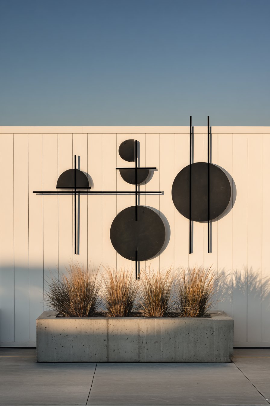 The supporting elements enhance rather than compete with the sculptural focal points. A sleek concrete planter box runs along the base, its smooth gray surface providing textural contrast to both the matte black metal and smooth white fence. Ornamental grasses planted within wave gently in the breeze, their soft organic movement counterbalancing the sculptures’ static geometry. The grasses’ vertical growth pattern echoes the wall’s height without overwhelming the space, while their golden-green color introduces warmth to an otherwise cool-toned palette.