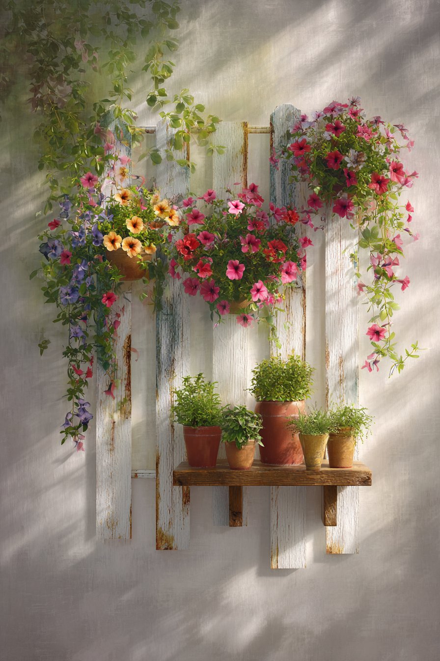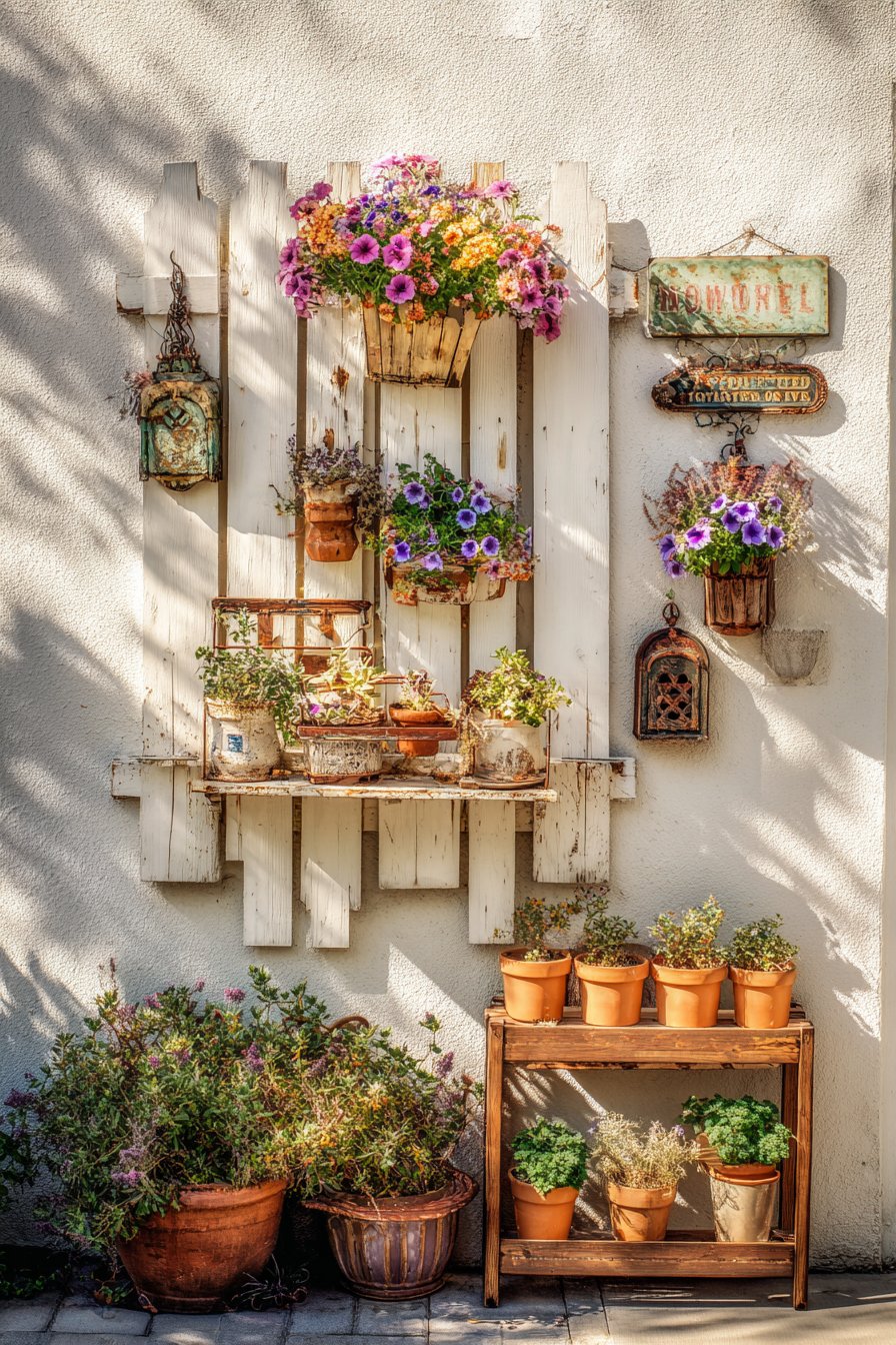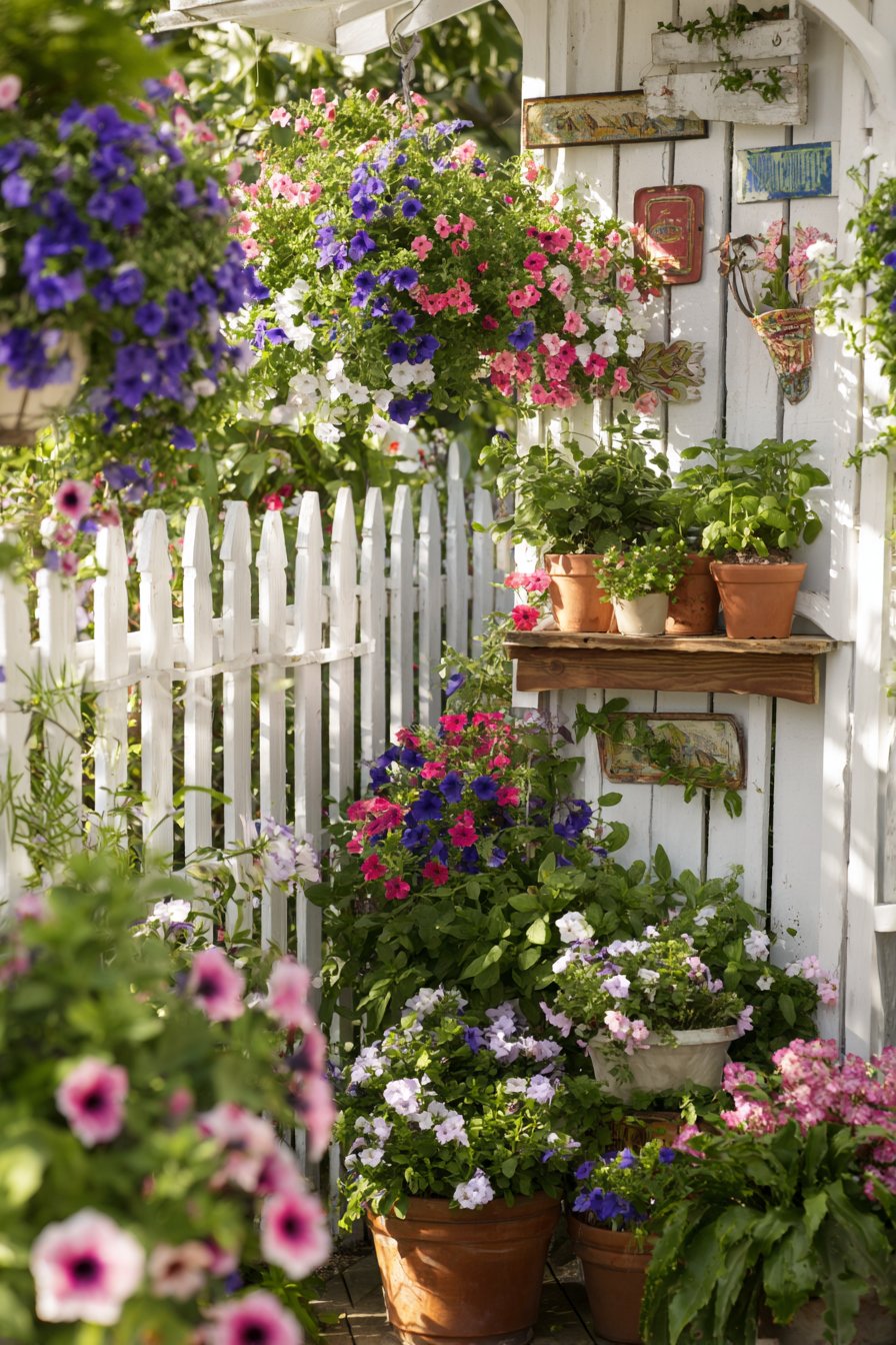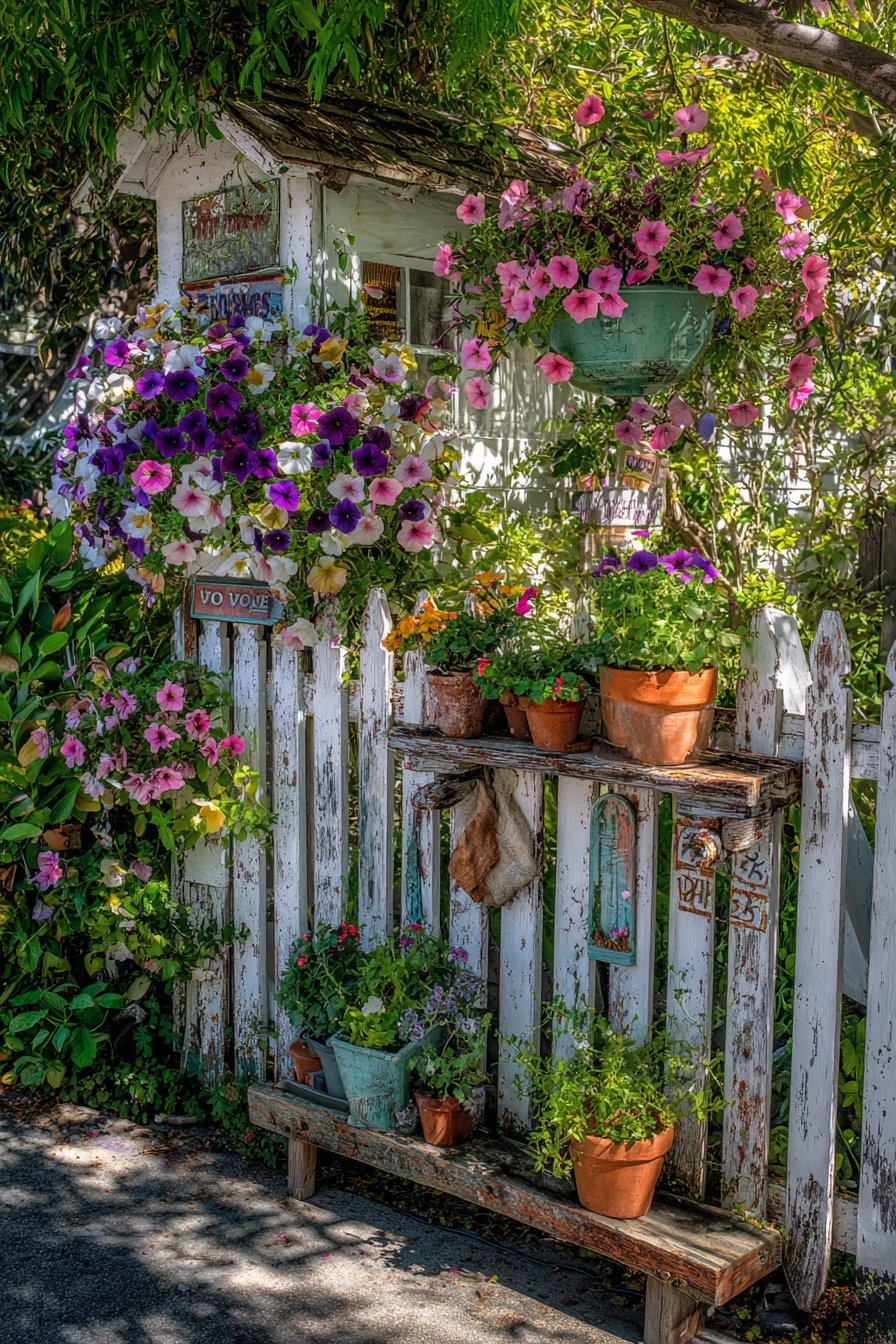 White picket fence sections repurposed as wall art immediately establish cottage garden charm through their nostalgic form and decorative potential. These architectural elements—whether authentic vintage pieces or well-crafted reproductions—bring vertical interest and provide perfect structures for hanging baskets overflowing with colorful petunias and trailing lobelia. The combination of structured fence and abundant flowers demonstrates the cottage garden principle of controlled abundance, where profusion feels intentional rather than neglected. Vintage garden signs in weathered metal and aged wood punctuate the arrangement with charming messages or botanical illustrations that reference seed packets and garden catalogs from earlier eras.