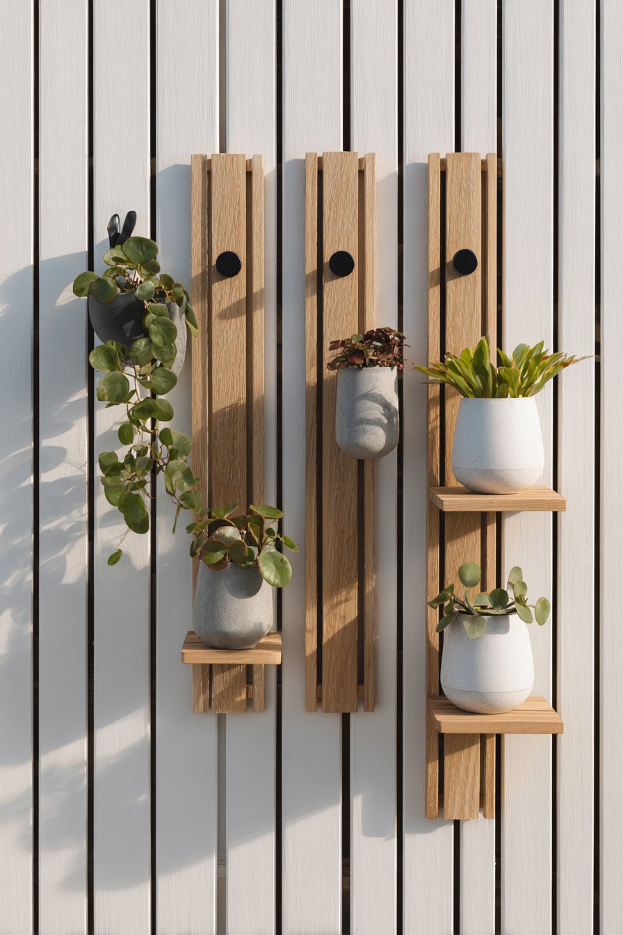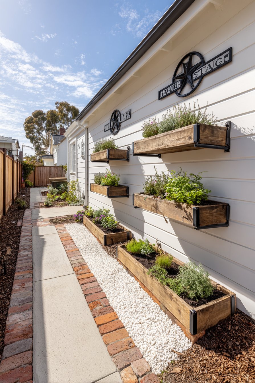 Positioned against a neutral stucco fence, this vertical garden creates dimensional interest through the interplay of organic and constructed elements. Terra cotta pavers form the base, their earthy tones complementing the wood while providing stable footing for maintenance. The three-dimensional quality of the arrangement becomes particularly striking during golden hour, when shadows emphasize each plant’s unique form and the wood’s textured surface gains depth and warmth. This design solution proves especially valuable for small backyards where horizontal growing space is limited but vertical potential remains untapped.