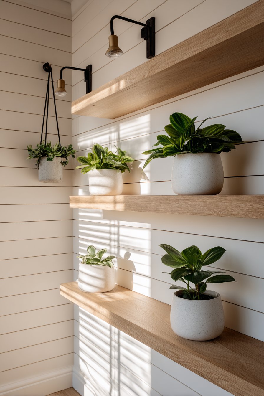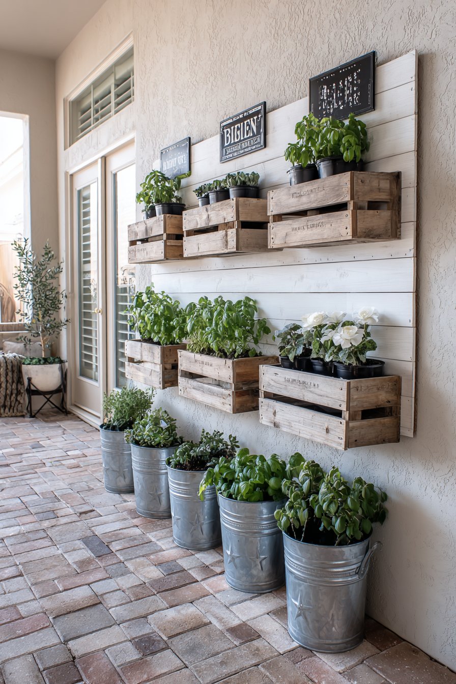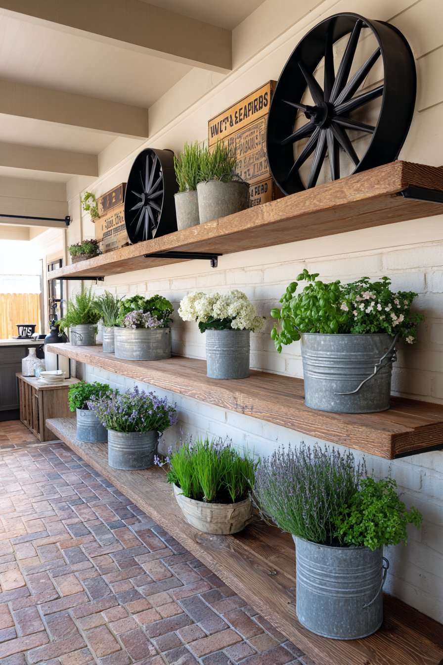 Open wooden shelving in natural or weathered finish displays galvanized metal buckets repurposed as planters for herbs and flowers. These utilitarian vessels demonstrate the farmhouse principle of functionality first, with beauty emerging from honest materials and practical forms rather than applied decoration. The base treatment uses reclaimed brick pavers, their irregular coloring and slight wear patterns suggesting age and established garden character. Natural wood grain shows through the painted shiplap where intended—the modern farmhouse style embraces this layering of finishes.