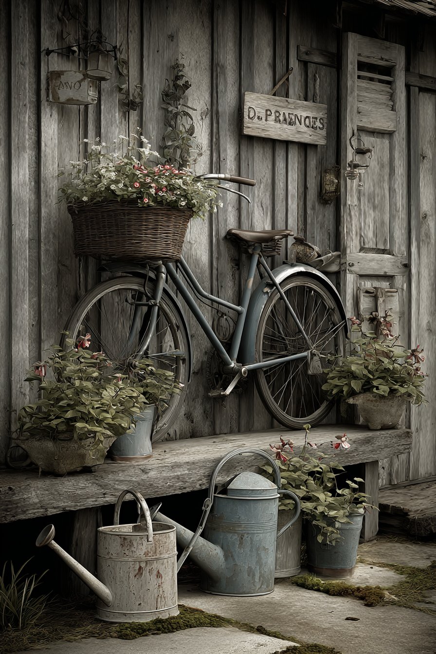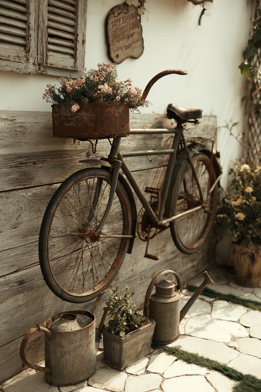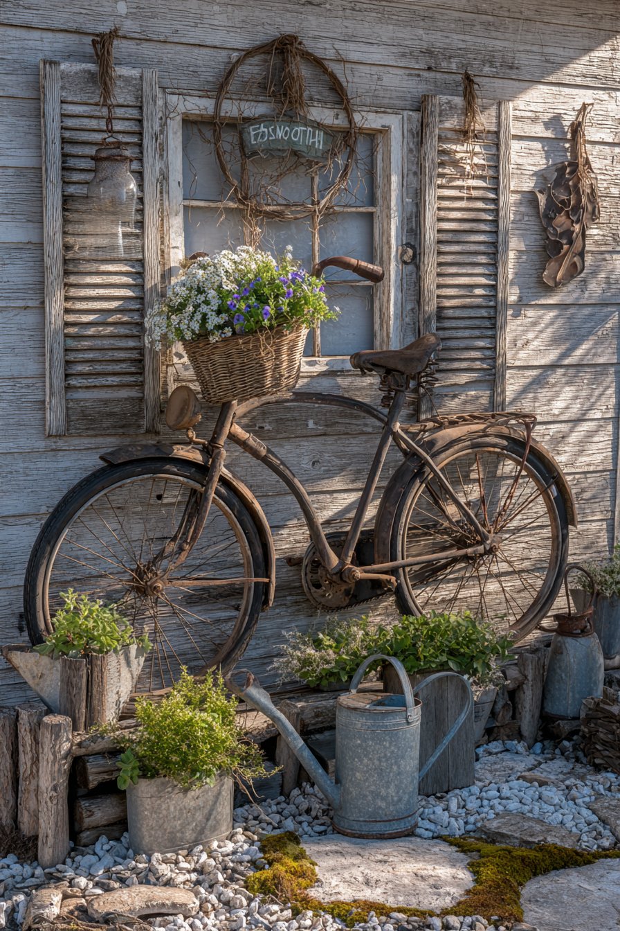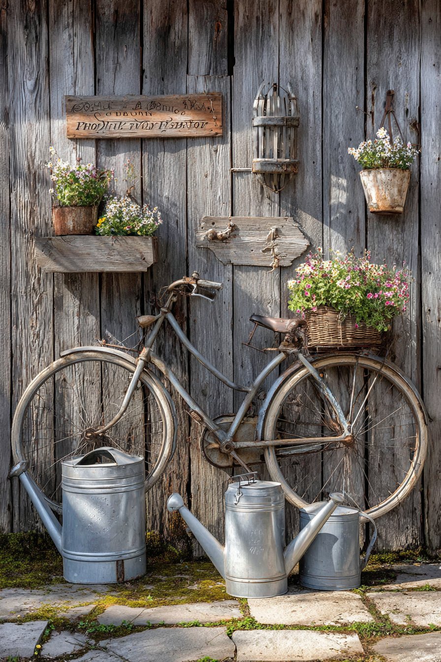 A single antique bicycle mounted on a weathered barn wood fence creates instant focal point through nostalgic charm and sculptural presence. The bicycle—perhaps a vintage cruiser, a ladies’ town bike, or even an old racing model—becomes three-dimensional wall art through its intricate mechanical details, curved lines, and inherent association with simpler times. Its basket overflows with trailing flowers like ivy geraniums, nasturtiums, or sweet potato vine, transforming a utilitarian carrier into a living planter that changes with seasons. Old window shutters flanking the bicycle add architectural interest while their weathered paint complements the barn wood’s aged surface.