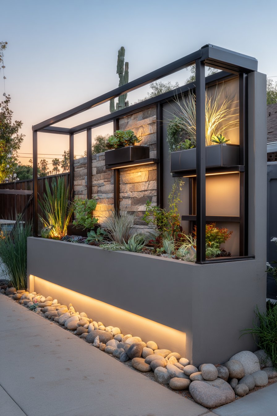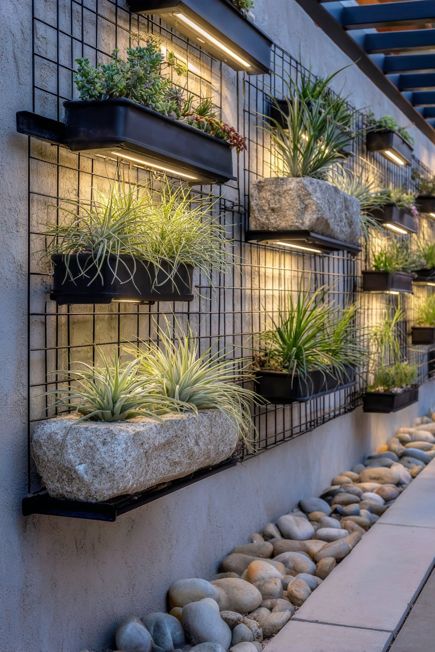 Integrated LED strip lighting along the top edge provides evening illumination that transforms the wall into a glowing feature after dark. This lighting highlights both the metal framework’s clean lines and the plants’ sculptural forms, creating dramatic shadows and emphasizing three-dimensional quality. The base treatment uses smooth river stones in neutral tones—grays and tans—that complement the color palette while providing definition between the vertical wall treatment and horizontal ground plane.